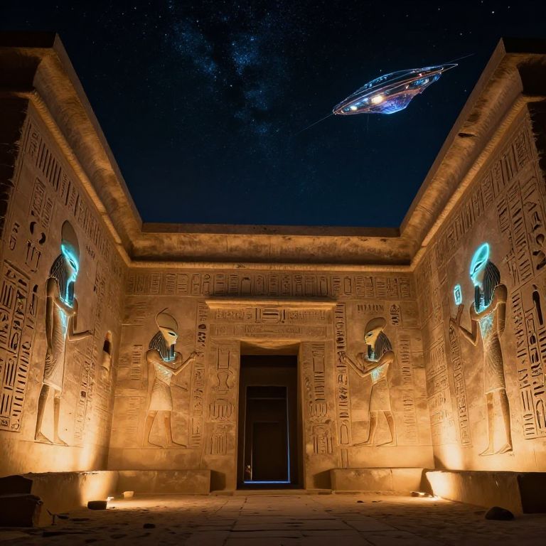 Photograph of an ancient Egyptian temple at night, illuminated by blue lights, featuring carved figures and a glowing UFO in the starry sky above.