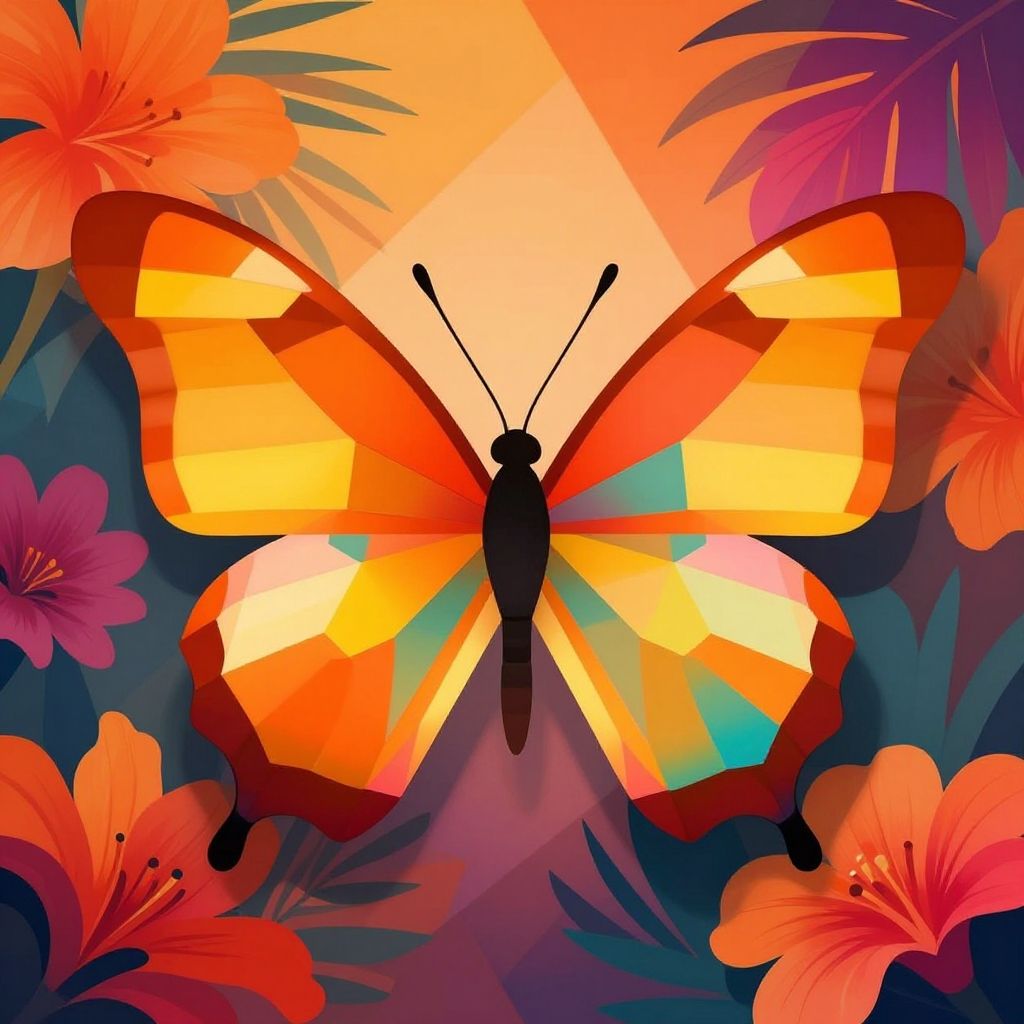 Abstract modern design featuring a bold, geometric butterfly in vibrant shades of orange, yellow, pink, and teal. The butterfly is centered against a vivid tropical floral background with warm-toned flowers in orange, red, and purple hues. The composition combines nature-inspired elements with a stylized, graphic aesthetic and a softly fading angular backdrop.