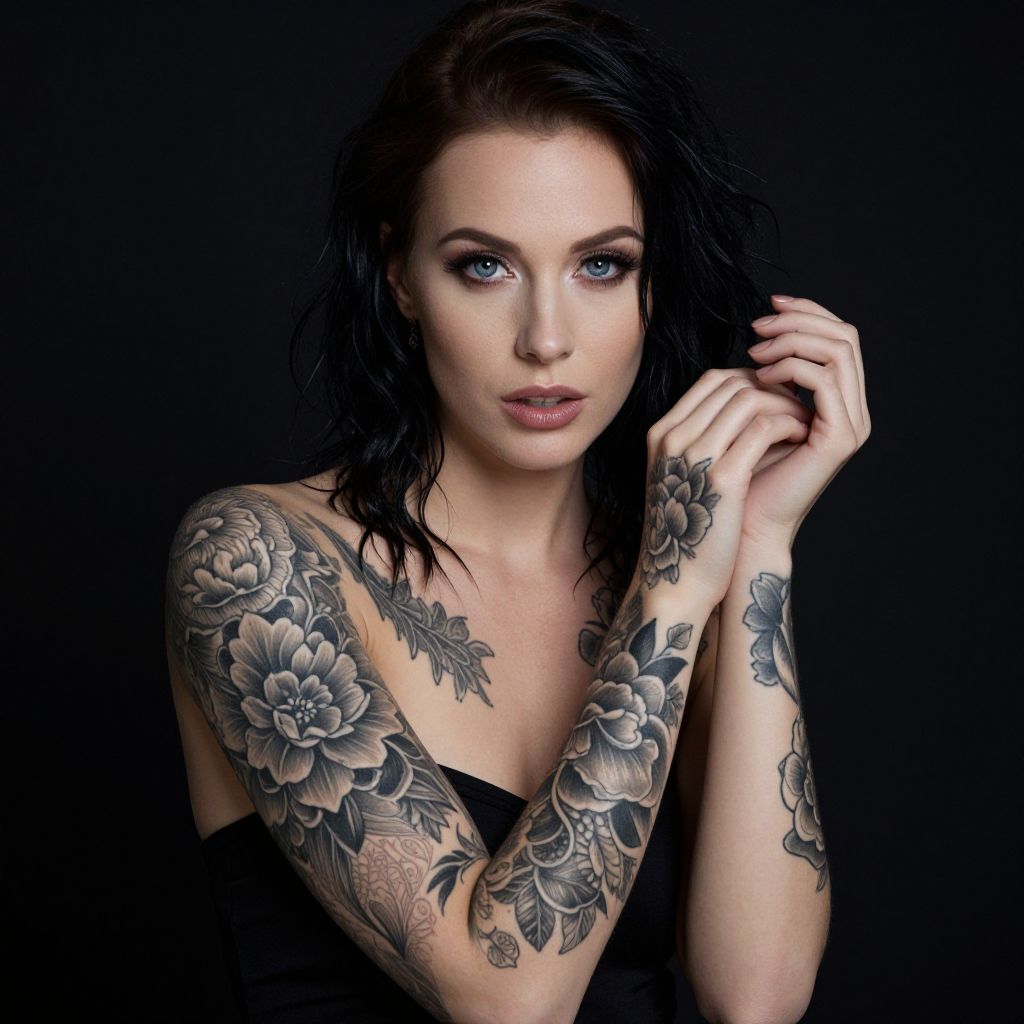 Photograph of a tattooed blonde woman with blue eyes, nose ring, white tank top, colorful arm and chest tattoos, dark background.