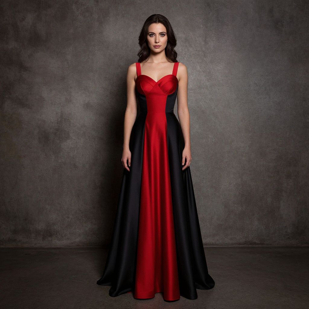 Photograph of a young woman standing against a dark, paneled wall. She has pale skin, long black hair, and wears a sleeveless, black, floor-length evening gown with a V-neck. Her red lipstick contrasts with the dark background. The lighting is dramatic, highlighting her figure and casting shadows that emphasize the texture of the gown and the wall. The floor is dark wood, adding to the moody, elegant ambiance. Her expression is neutral, and she stands with her arms relaxed at her sides. The overall style is sophisticated and gothic.