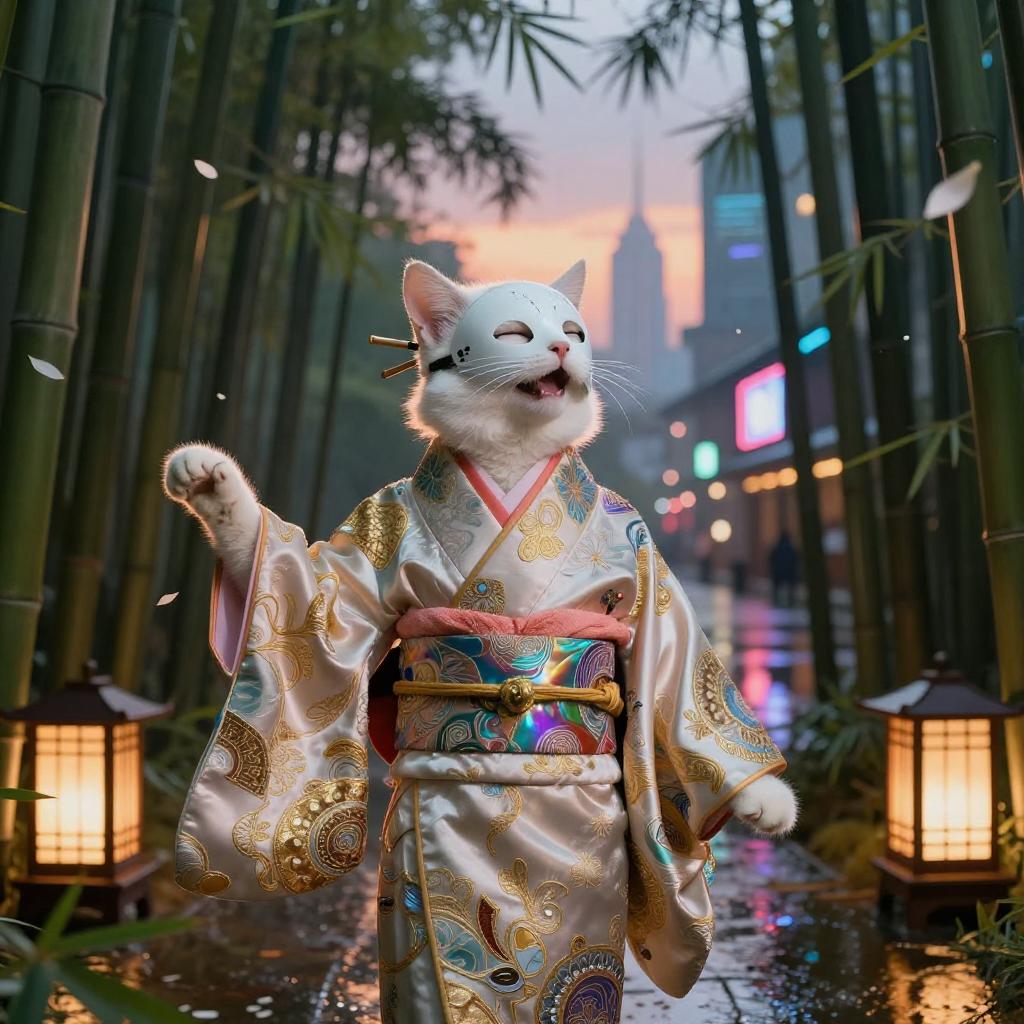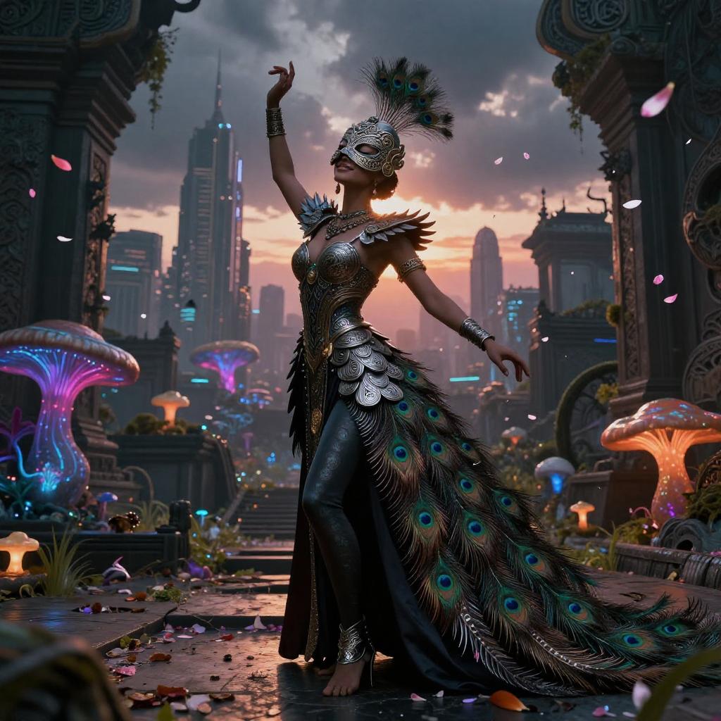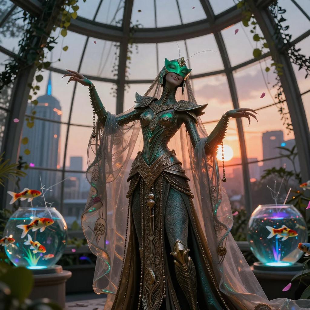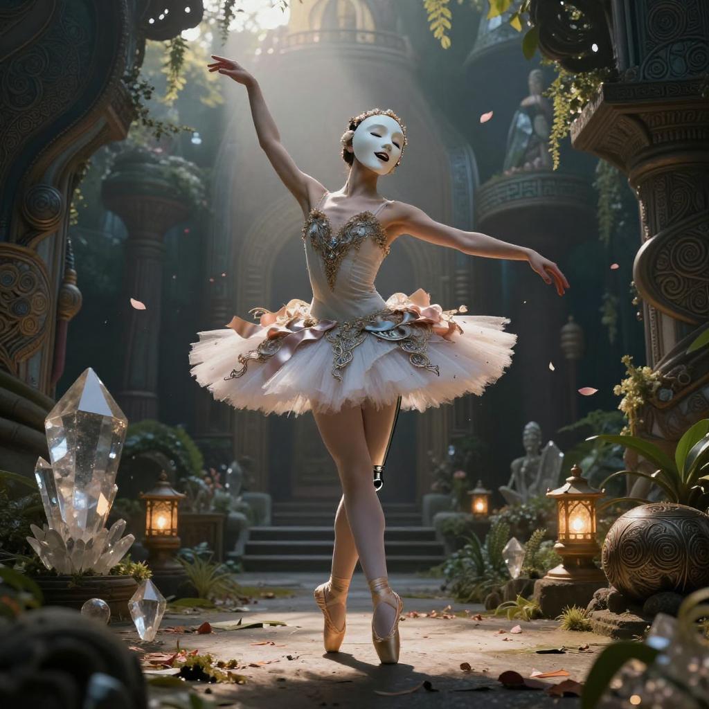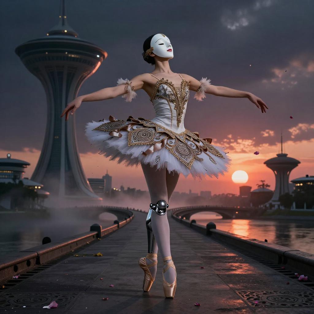 Best quality, masterpiece, ultra high res, raw photo, beautiful and aesthetic, deep shadow, dark theme, (photorealistic:1.4), porcelain-masked marionette ballerina with articulated brass joints and a faintly cracked ivory face, wearing tattered alabaster satin tutu reinforced with alloy corsetry, zentangle-etched ribbon streamers and petite brass pointe shoes, soft smile, open mouth, closed eyes, ((chiaroscuro, backlight, twilight, petals floating)), graceful poise, evocative atmosphere, magnetic presence, captivating mystique, intricate zentangle patterns, astonishing level of detail, striking perspective, a chaotic masterpiece balanced by harmony, vibrant color palette, ((outdoors)), abandoned glass greenhouse overrun with neon orchids, bioluminescent moss and shattered skylights revealing a distant neon futurist skyline, rain-misted panes and drifting petals, inspired by futurist architecture