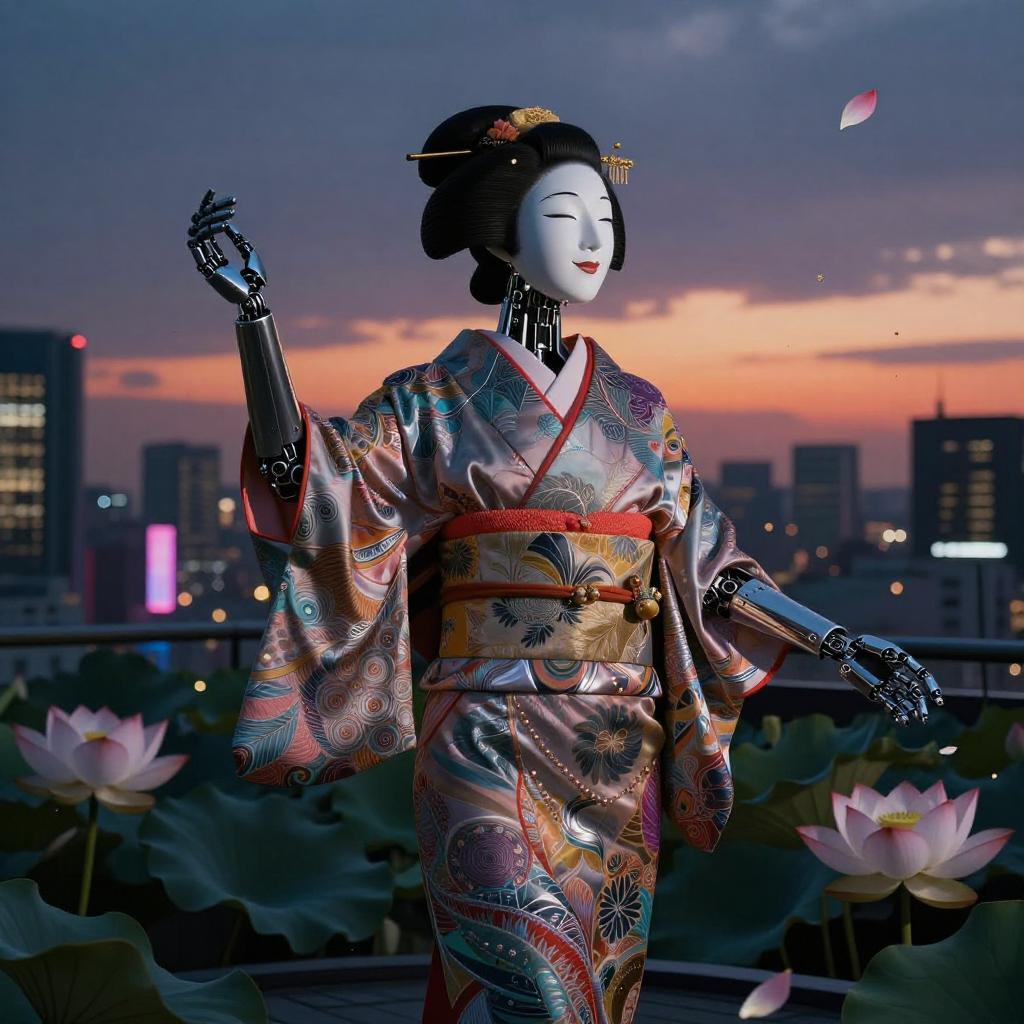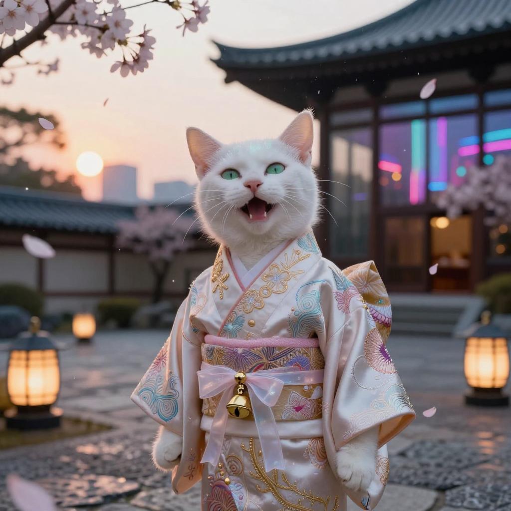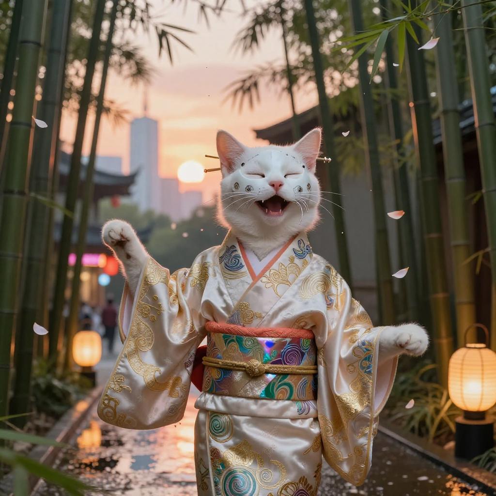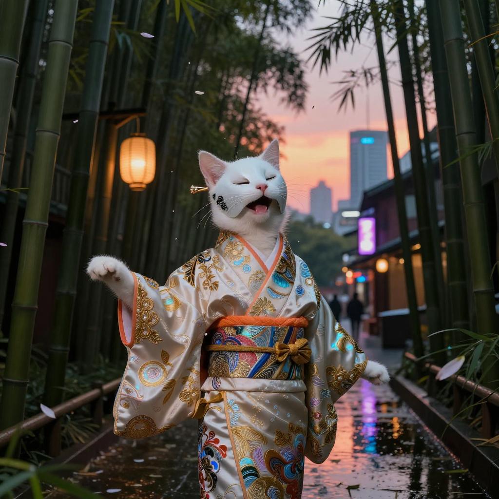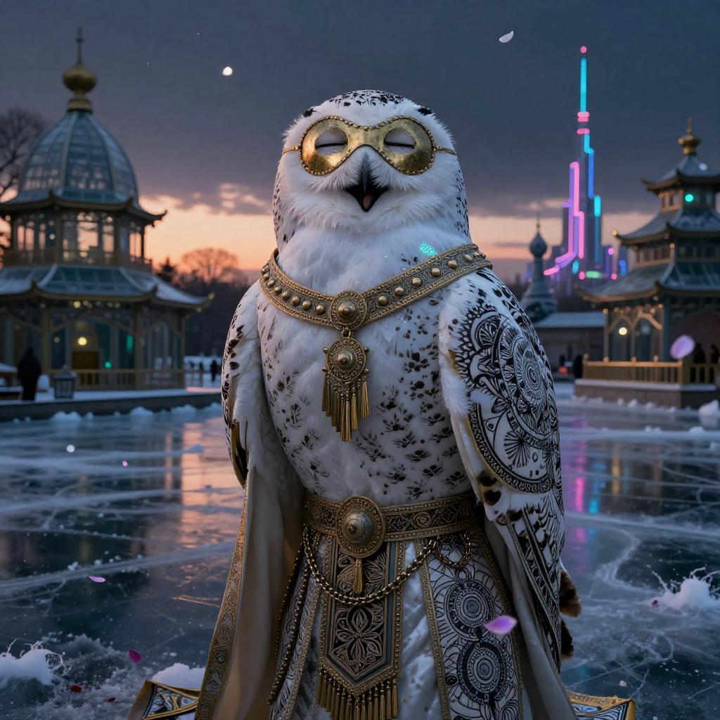 Best quality, masterpiece, ultra high res, raw photo, beautiful and aesthetic, deep shadow, dark theme, (photorealistic:1.4), porcelain-masked marionette ballerina with articulated brass joints and a faintly cracked ivory face, wearing tattered alabaster satin tutu reinforced with alloy corsetry, zentangle-etched ribbon streamers and petite brass pointe shoes, soft smile, open mouth, closed eyes, ((chiaroscuro, backlight, twilight, petals floating)), graceful poise, evocative atmosphere, magnetic presence, captivating mystique, intricate zentangle patterns, astonishing level of detail, striking perspective, a chaotic masterpiece balanced by harmony, vibrant color palette, ((outdoors)), abandoned glass greenhouse overrun with neon orchids, bioluminescent moss and shattered skylights revealing a distant neon futurist skyline, rain-misted panes and drifting petals, inspired by futurist architecture
