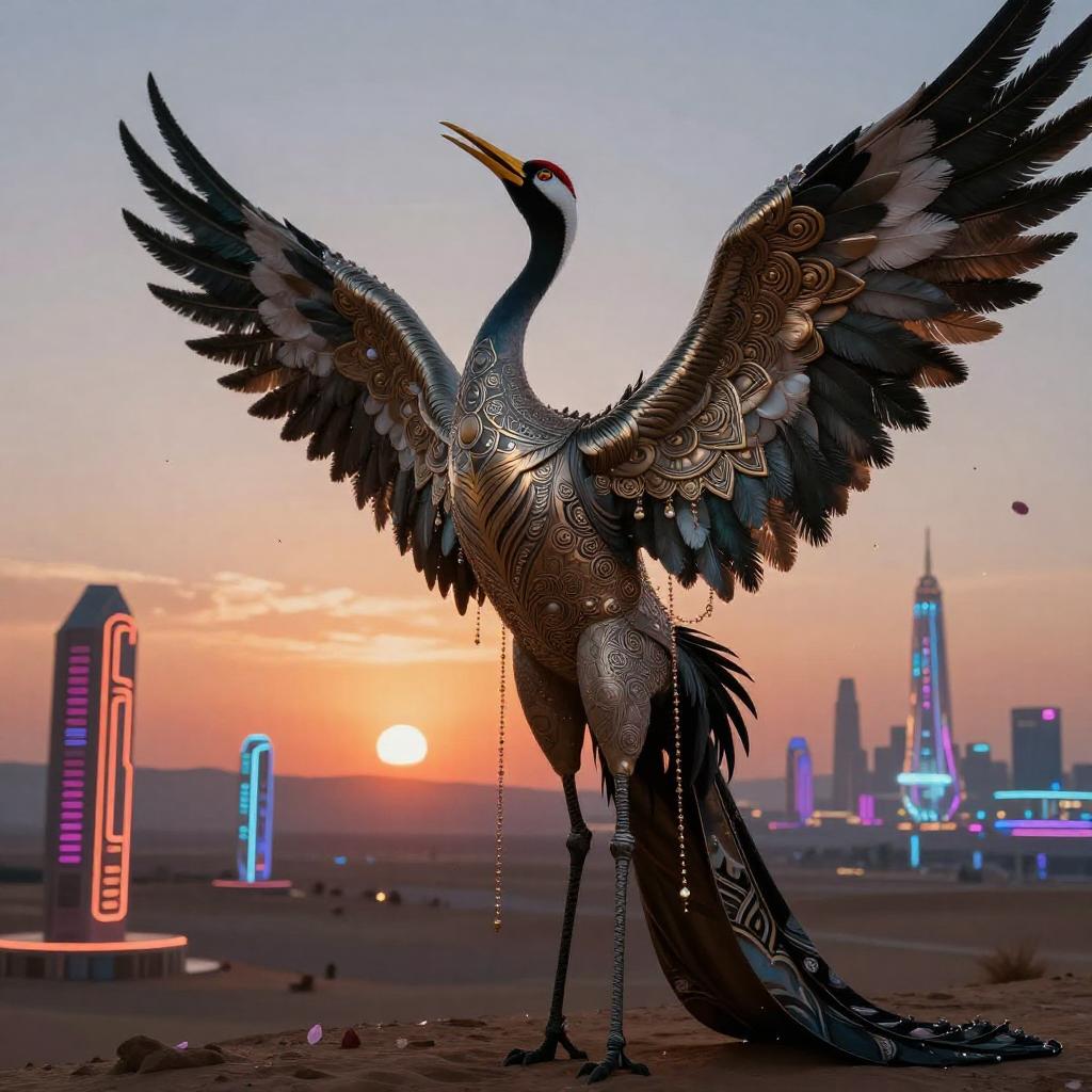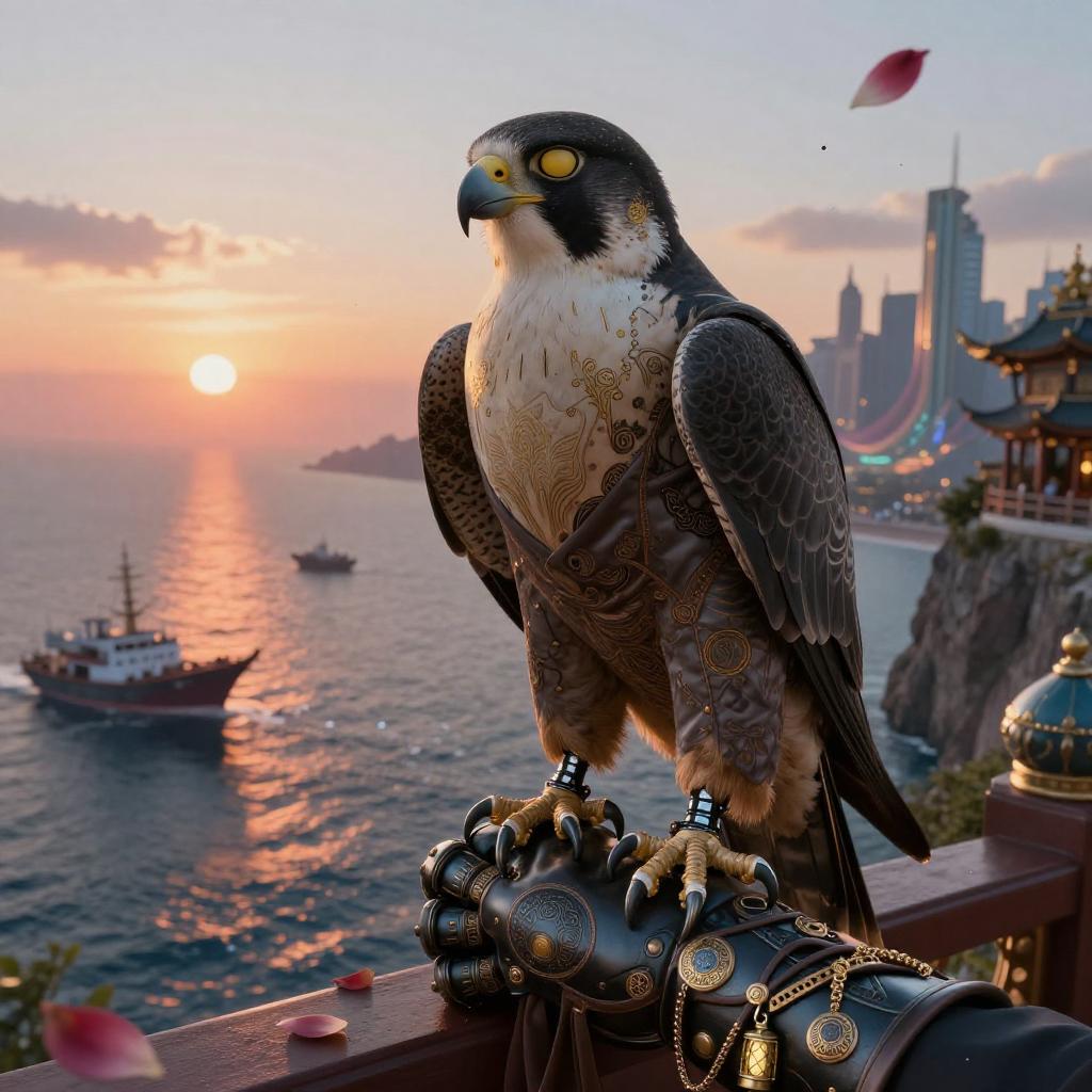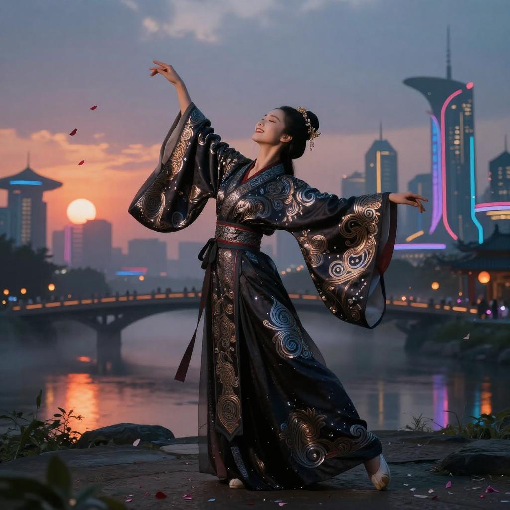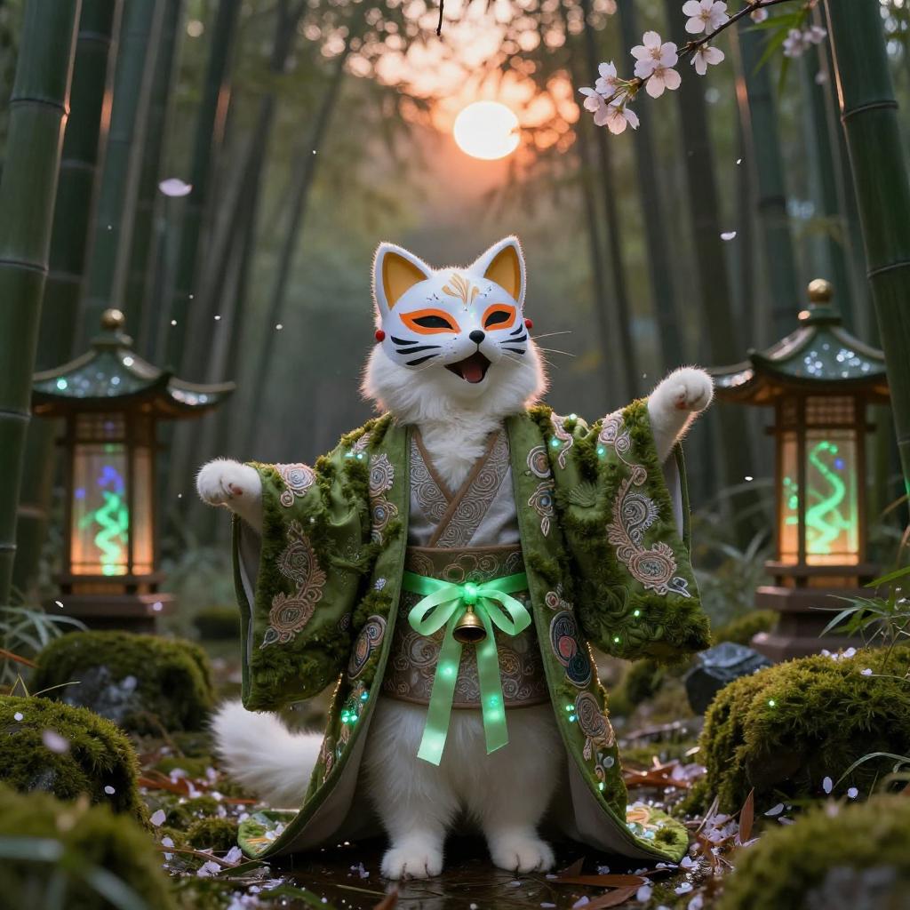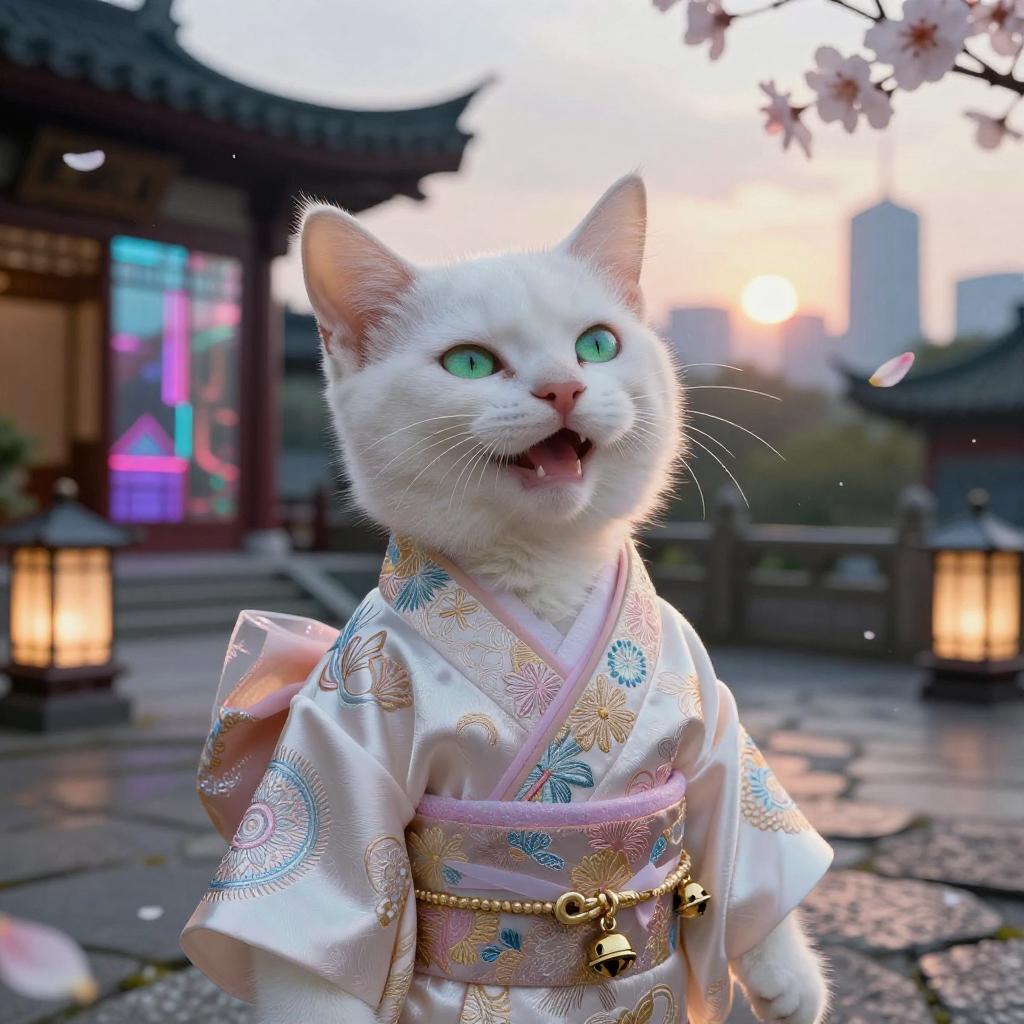 Best quality, masterpiece, ultra high res, raw photo, beautiful and aesthetic, deep shadow, dark theme, (photorealistic:1.4), porcelain-masked marionette ballerina with articulated brass joints and a faintly cracked ivory face, wearing tattered alabaster satin tutu reinforced with alloy corsetry, zentangle-etched ribbon streamers and petite brass pointe shoes, soft smile, open mouth, closed eyes, ((chiaroscuro, backlight, twilight, petals floating)), graceful poise, evocative atmosphere, magnetic presence, captivating mystique, intricate zentangle patterns, astonishing level of detail, striking perspective, a chaotic masterpiece balanced by harmony, vibrant color palette, ((outdoors)), abandoned glass greenhouse overrun with neon orchids, bioluminescent moss and shattered skylights revealing a distant neon futurist skyline, rain-misted panes and drifting petals, inspired by futurist architecture