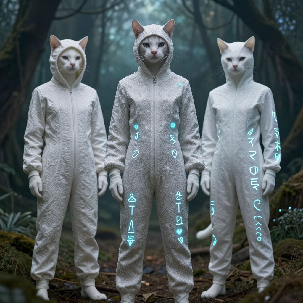 Photograph of three white cats in white, hooded, textured, glow-accented suits standing in a dark, foggy forest.