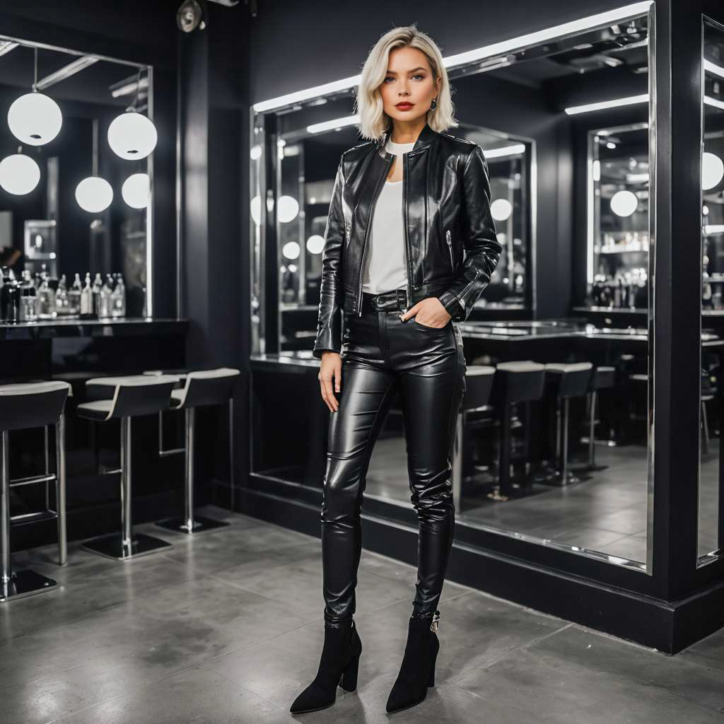 Petite blonde woman with wave bob hairstyle wearing a black leather jacket and matching leather pants. She pairs the outfit with a white ivory cotton t-shirt, black platform boots, and silver accessories. The photo is taken in a modern nightclub setting with dramatic lighting and reflective mirrors.