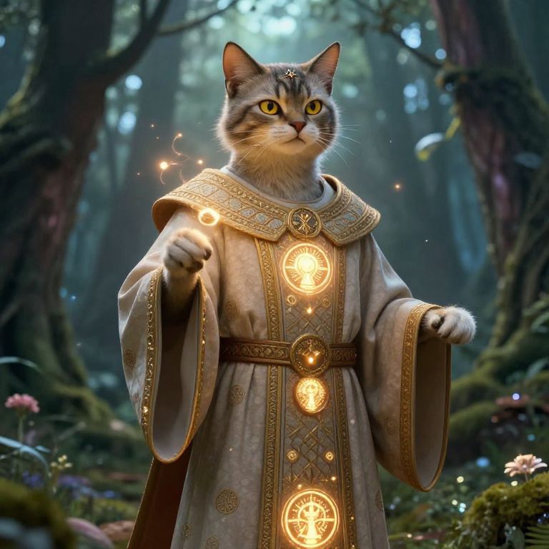 Tabaxi cleric standing in a mystical forest, wearing ornate robes with glowing holy symbols, feline features expressive and alert, magical aura surrounding, fantasy art style