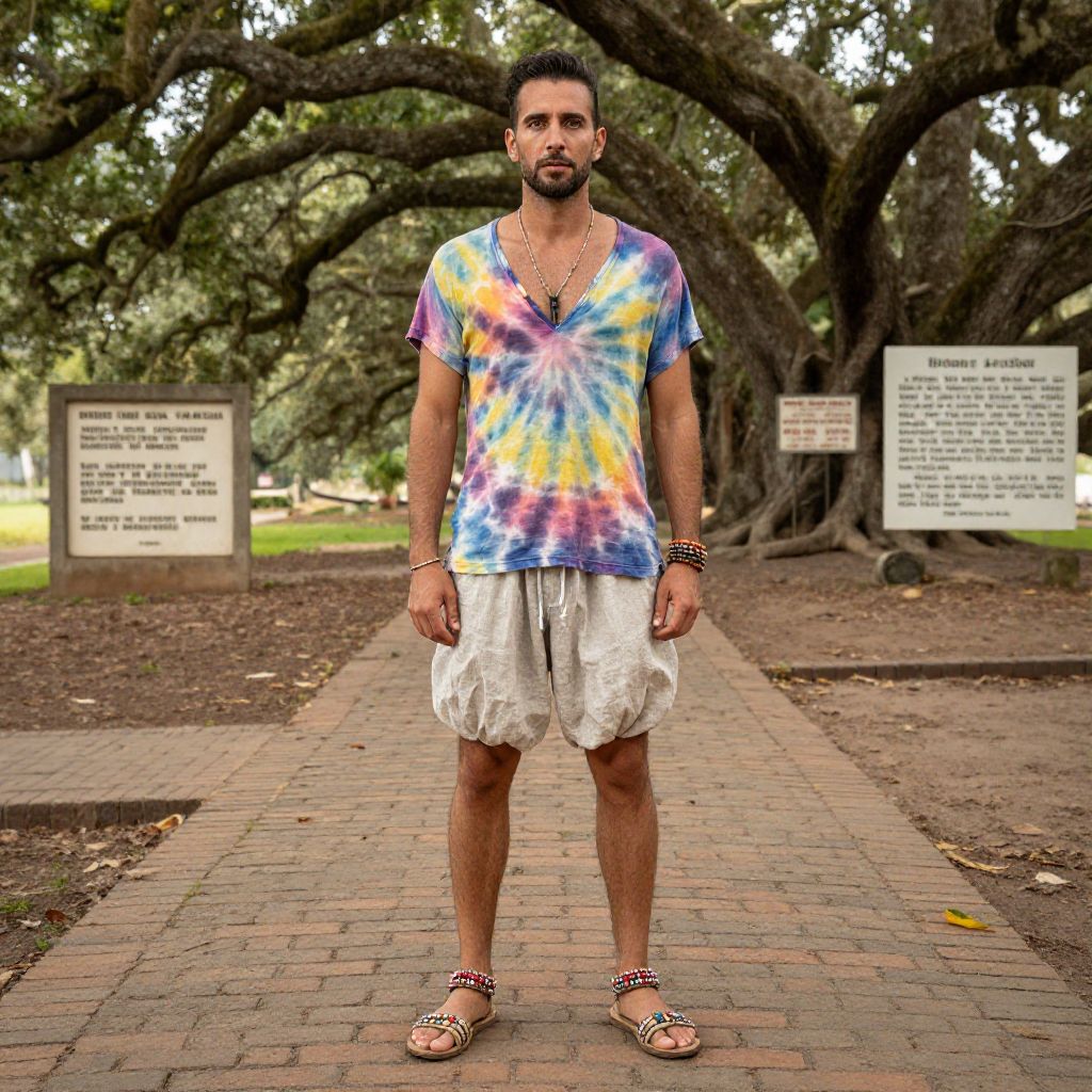 A man, flowy tie-dye shirt, loose linen shorts, beaded sandals, vibrant colors, bohemian vibe, ancient oak trees, brick pathways, historic plaques detailing past events, vintage photo style, serene expression Man has masculine face and piercing eyes