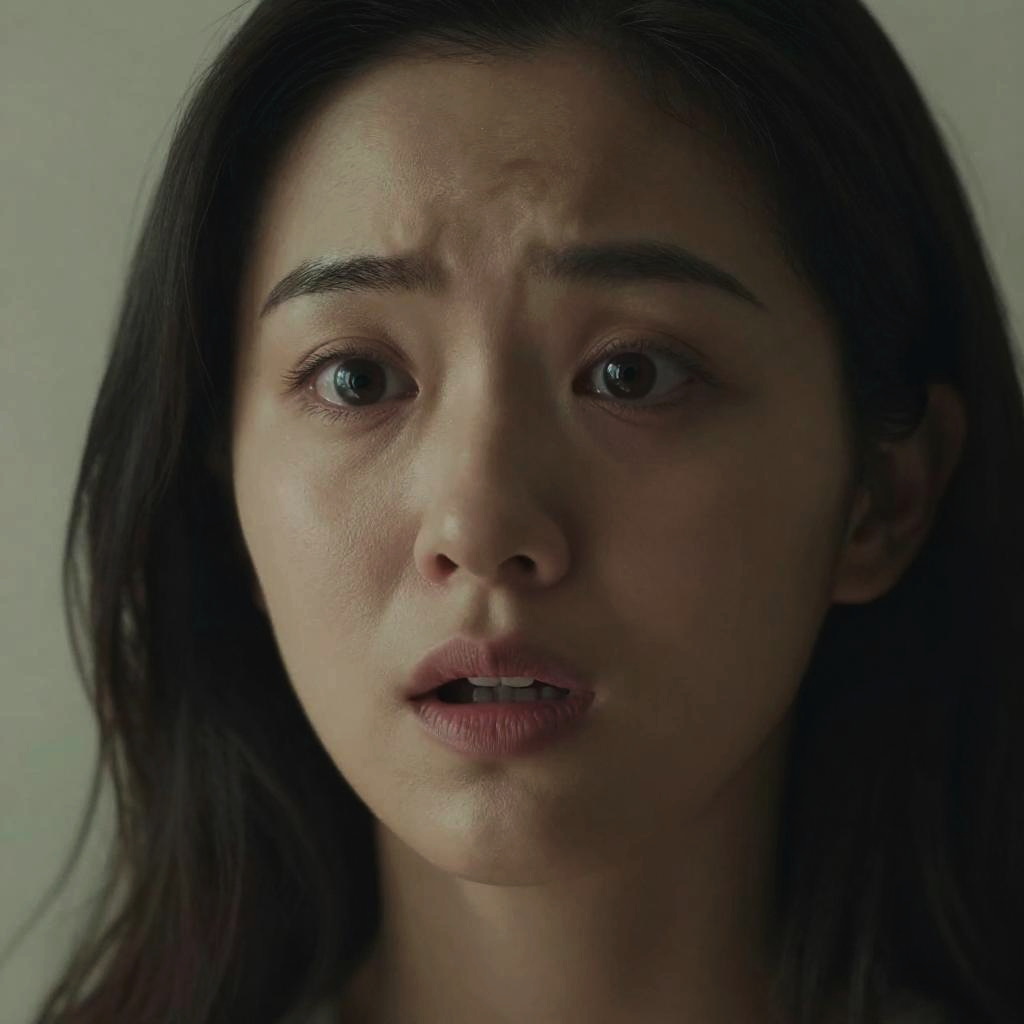 Aah expression on a young woman's face, wide eyes, slightly open mouth, soft natural lighting, close-up portrait, cinematic style, emotional and vivid detail