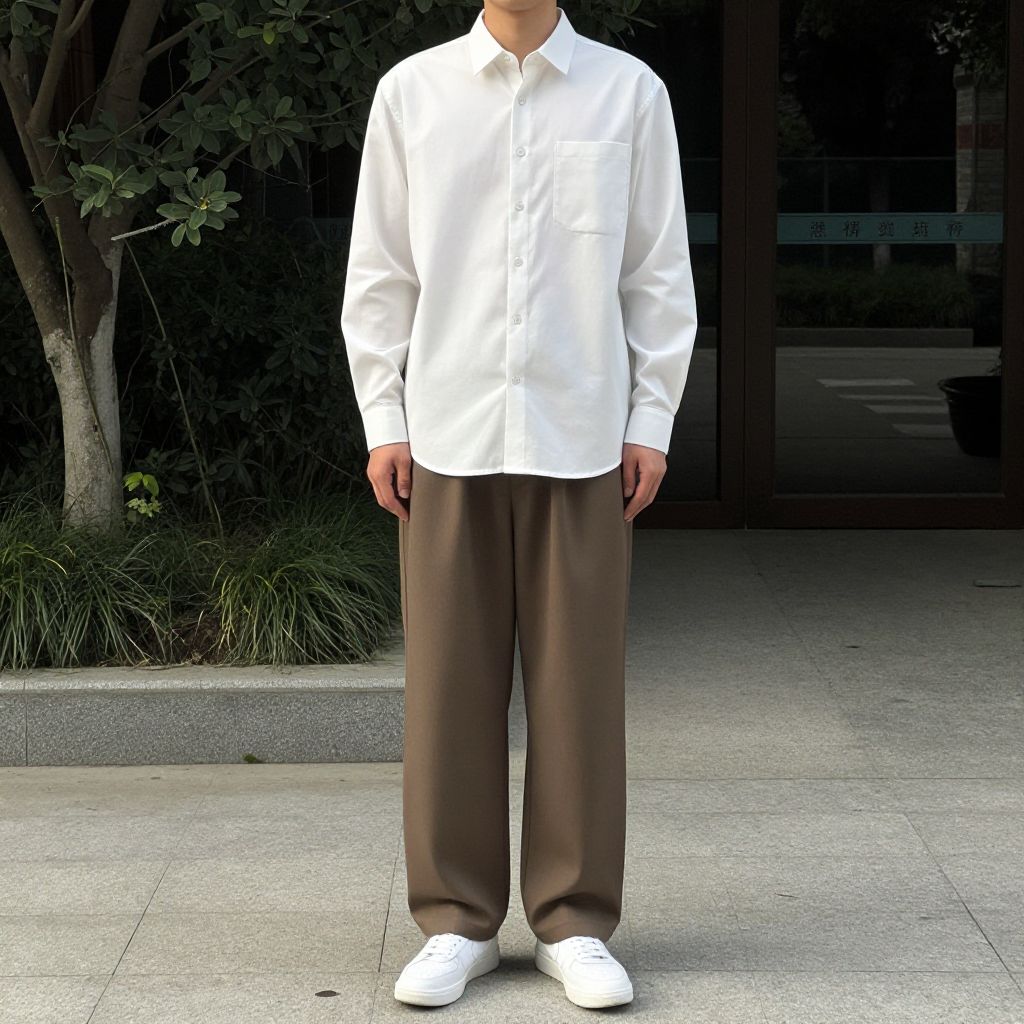 Photograph of a person standing outdoors on a concrete sidewalk. The person is wearing a white, long-sleeved, button-up shirt, brown loose-fitting pants, and white sneakers. The shirt is crisp and unbuttoned at the top. The person's face is not visible, as the head is cropped out of the frame. The background includes a tree with green leaves and a dark, glass-fronted building. The scene is well-lit with natural light, highlighting the textures of the shirt and pants. The overall style is casual and minimalist.