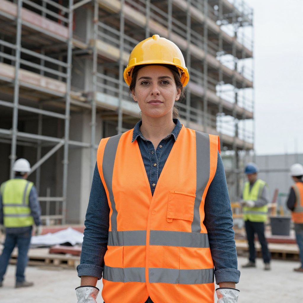 Photograph of a serious woman wearing an orange safety vest and yellow hard hat, standing in front of a construction site with scaffolding and other workers in
