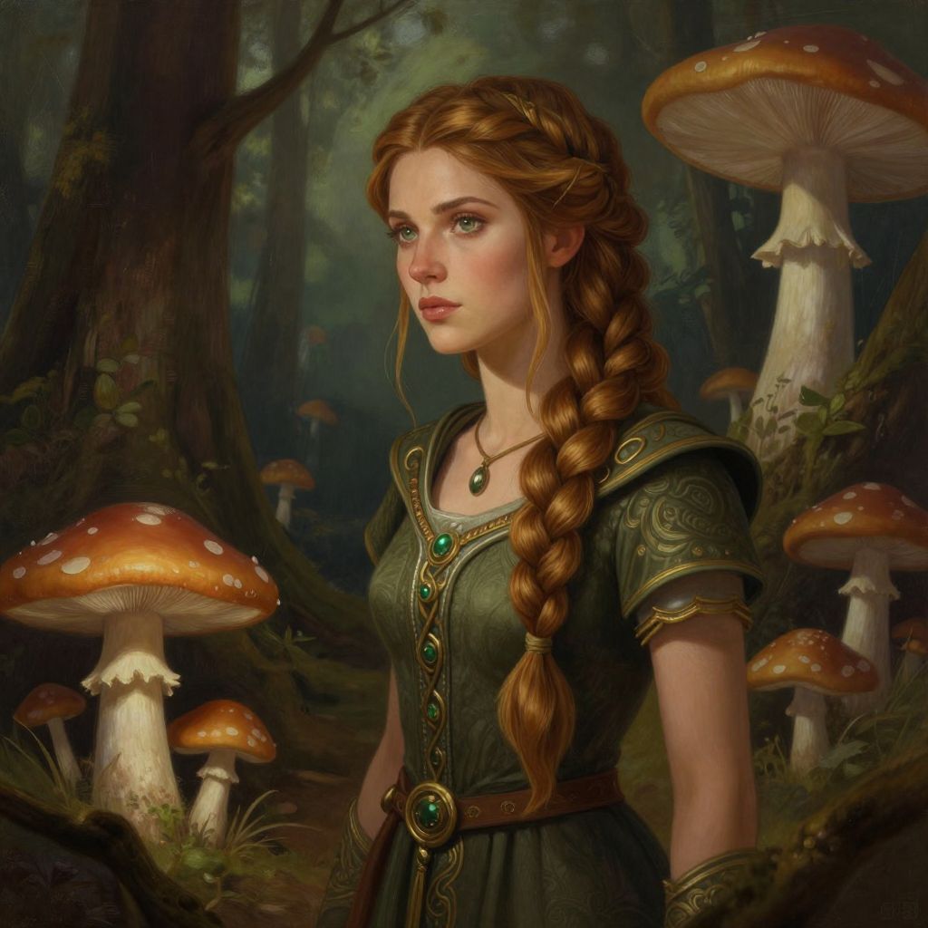 Digital fantasy artwork of a young woman with fair skin and red-blonde hair in a long braid, standing in a lush forest. She has green eyes and wears a medieval-style, dark green dress with ornate gold and green embroidery, a green gemstone necklace, and matching arm cuffs. Surrounding her are large, orange-capped mushrooms with white spots, set against a dark, misty forest background. The lighting emphasizes her gentle expression and the intricate details of her attire. The style is highly detailed and realistic, with a focus on fantasy elements.
