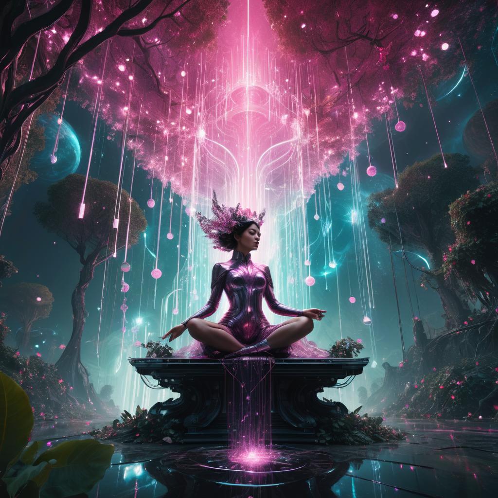 This digital art depicts a mystical, cyberpunk scene featuring a woman with dark skin and curly hair, sitting cross-legged on a stone pedestal in a lush, moonlit forest. She wears a form-fitting, purple and pink bodysuit that reflects the vibrant, neon lights surrounding her. Her hands rest on her knees, palms up, in a meditative pose. Above her, a radiant, glowing tree with pink and blue lights cascades down like a waterfall, illuminating the water below. Glowing orbs and particles float around her, adding to the ethereal atmosphere. The background is dense with trees and foliage, creating a rich, textured forest setting.