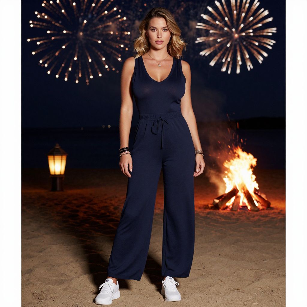 A busty woman in a casual summer sleeveless navy jumpsuit with wide-leg pants and white athletic sneakers, layered bracelets, and natural makeup, stands at a beach bonfire with fireworks illuminating the night sky. The visual style is reminiscent of Chuck Close. Sexy. Pretty face and beаutiful eyes. Big breasts