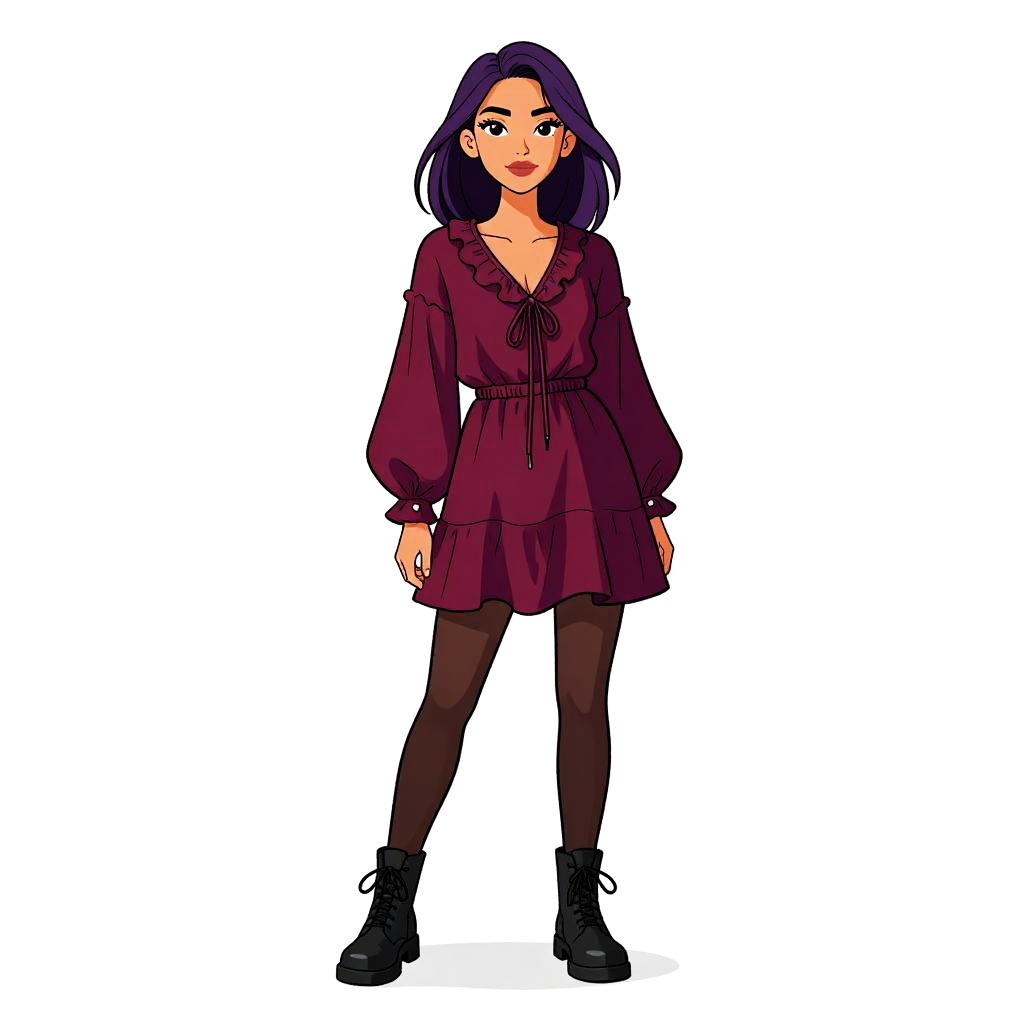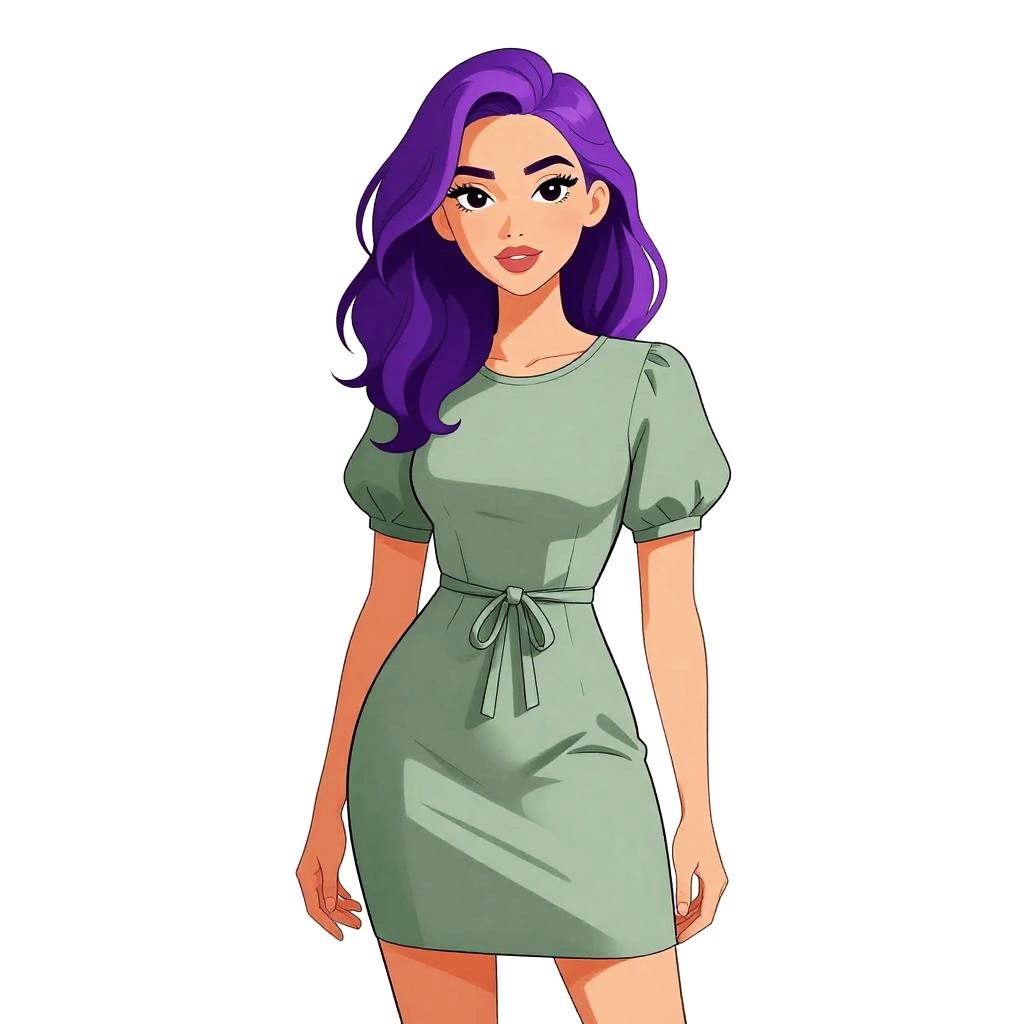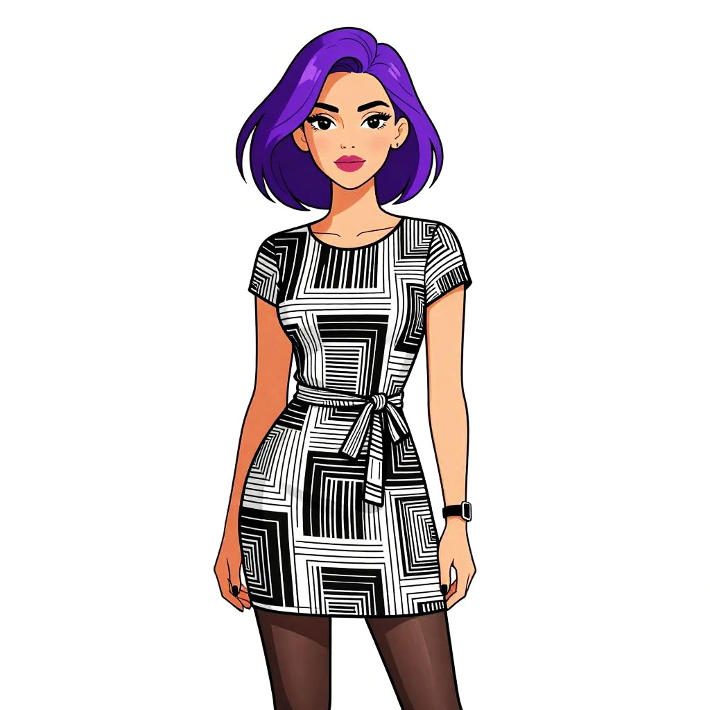 Woman with pretty face and pretty hair. Woman, casual retro, short-sleeved mini dress with a polka dot pattern in navy blue and white, Peter Pan collar, button-down bodice, fitted waist with a front tie, lightly pleated skirt, plain white background. --sref 1467