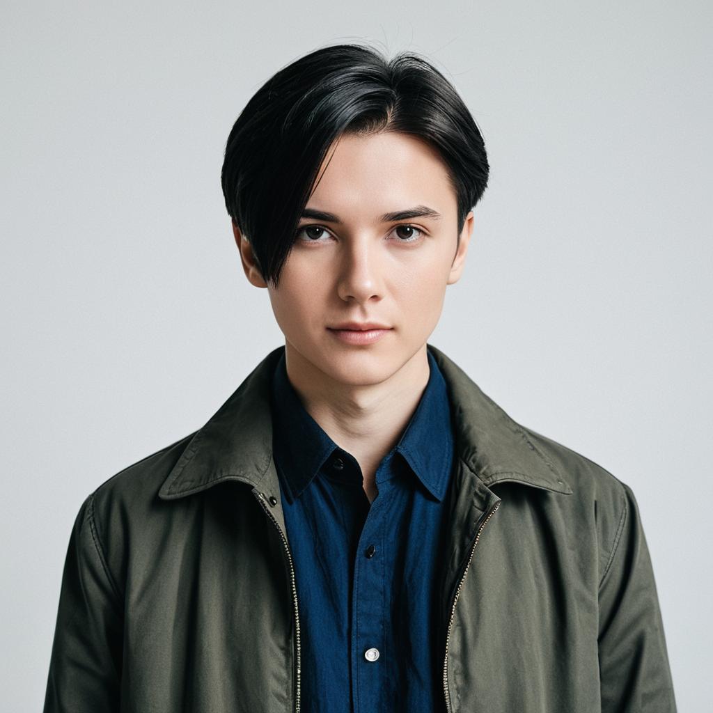 Portrait of a teenage male with short blonde hair wearing a blue zip-up jacket over a light button-up shirt. The subject has fair skin and blue eyes, posing against a plain light gray background. The style is casual and clean, suitable for fashion or lifestyle content.