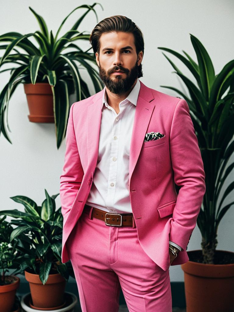 Pink pimp suit, 1boy, male focus, solo, pink pants, facial hair, shirt, suit, jacket, hands in pockets, pink jacket, pants, white shirt, collared shirt, brown hair, looking at viewer, standing, formal, plant, beard, potted plant, realistic, long sleeves, cowboy shot