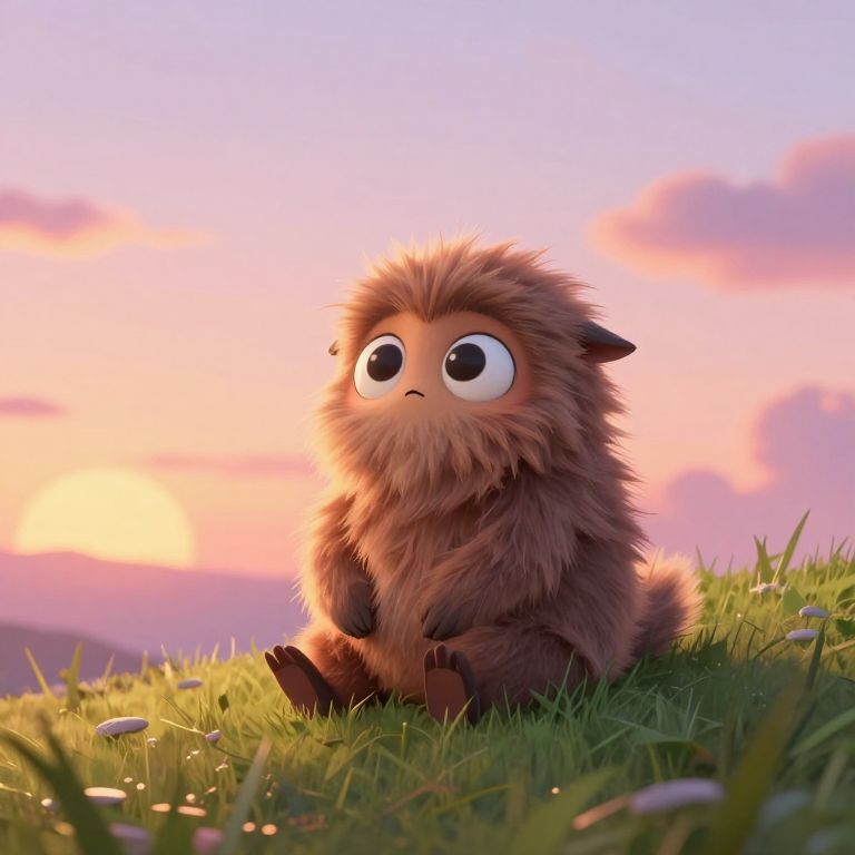 A digital illustration of a cute, fluffy, brown, cartoonish creature with large, round, black eyes and small black ears, sitting on a grassy hill during sunset. The creature has a slightly surprised expression and is surrounded by tiny white flowers. The background features a vibrant, pastel-colored sky with pink, purple, and orange hues, and soft, fluffy clouds. The grass in the foreground is lush and detailed, with sunlight creating a warm, golden glow on the creature's fur and the grass. The style is whimsical and adorable, with a focus on soft textures and vibrant colors.