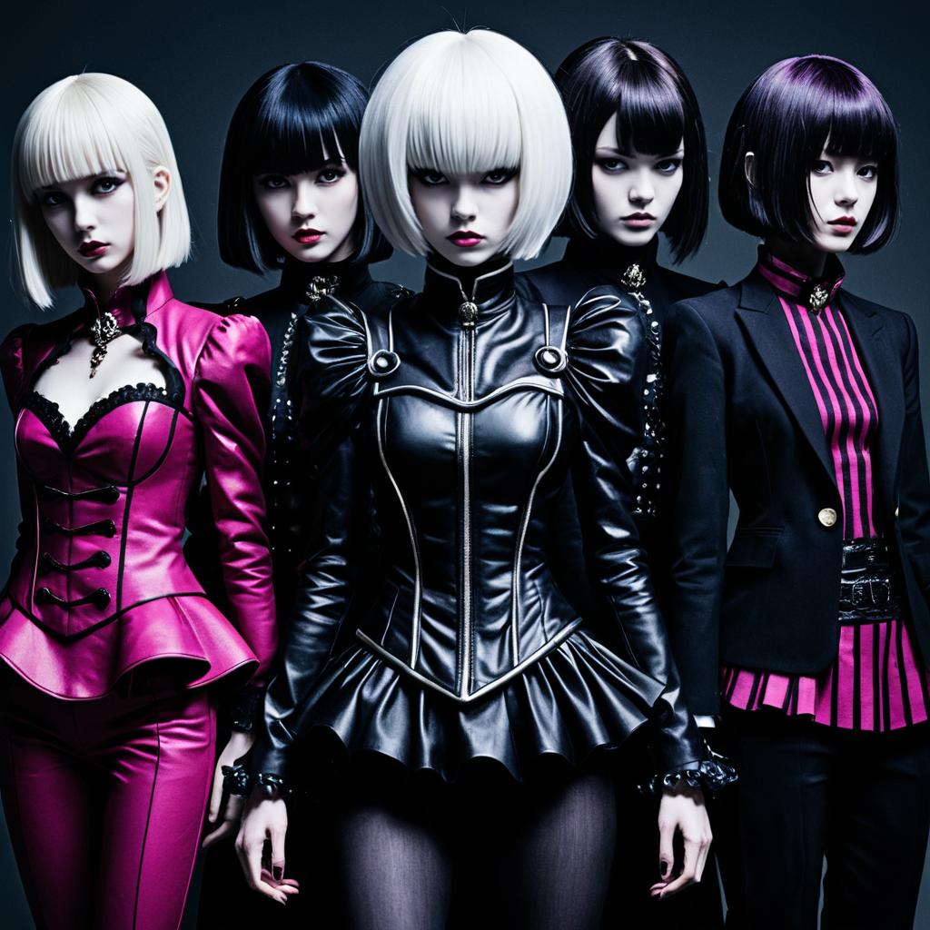Eleven anime characters dressed in dark colors, style inspired by Alexander McQueen, Go Nagai, horror-inspired, with body extensions, dark white and magenta palette, detailed,