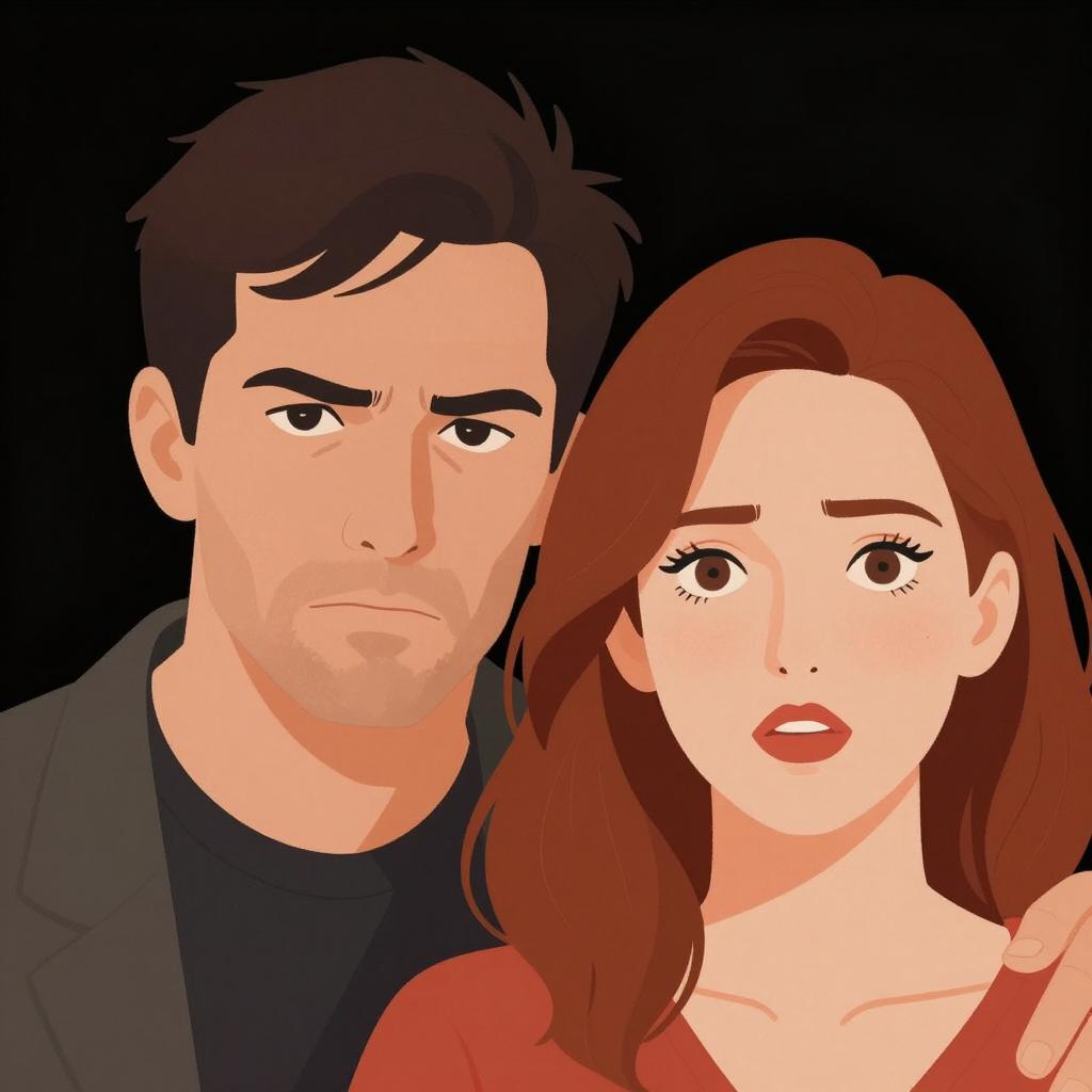 Digital illustration of three people. Foreground: man with wide-brimmed hat, worried expression, light brown skin, light shirt. Center: woman with short dark hair, earrings, slightly turned head, serious expression, light brown skin. Background: man with light brown skin, smiling, light brown suit. Warm brown and orange tones. Artist "OV" in bottom left corner.