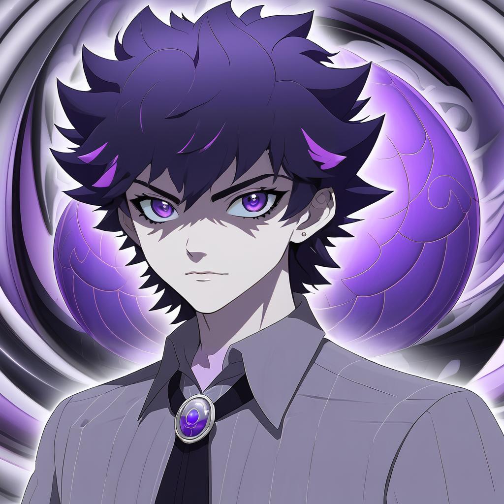 Illustration of an anime-style young male character with short, spiky two-tone hair in black and grey, striking purple eyes with white and symbol-shaped pupils. He is wearing a grey collared long-sleeve shirt with a black neck ribbon featuring a large purple gemstone pendant. The background highlights amethyst-inspired swirls and purple hues, emphasizing a mystical or magical theme.