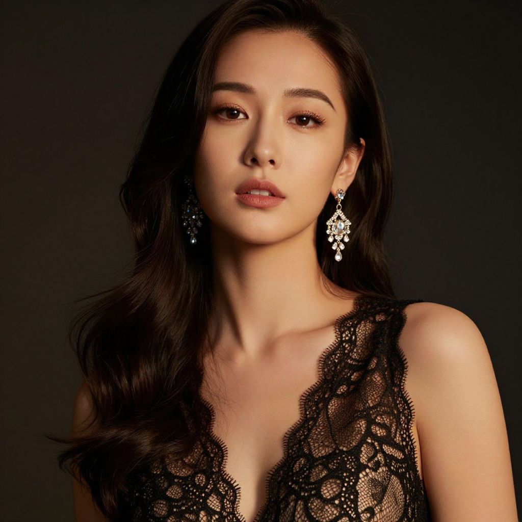 This stunning image features a woman with elegant makeup and a chic bob hairstyle, wearing a black lace top that beautifully contrasts with a soft turquoise background. The intricate floral patterns on her attire add a touch of sophistication, perfect for fashion or beauty themes.