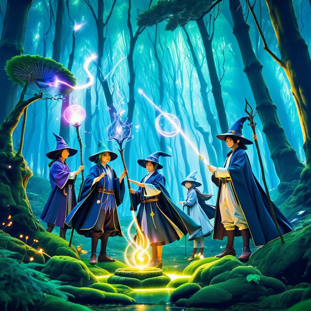 Anime-style illustration of five wizards in blue robes and pointed hats casting glowing magical spells in an enchanted, moss-covered forest. The scene is vibrant with mystical light effects and tall, bare trees, evoking a fantasy atmosphere.