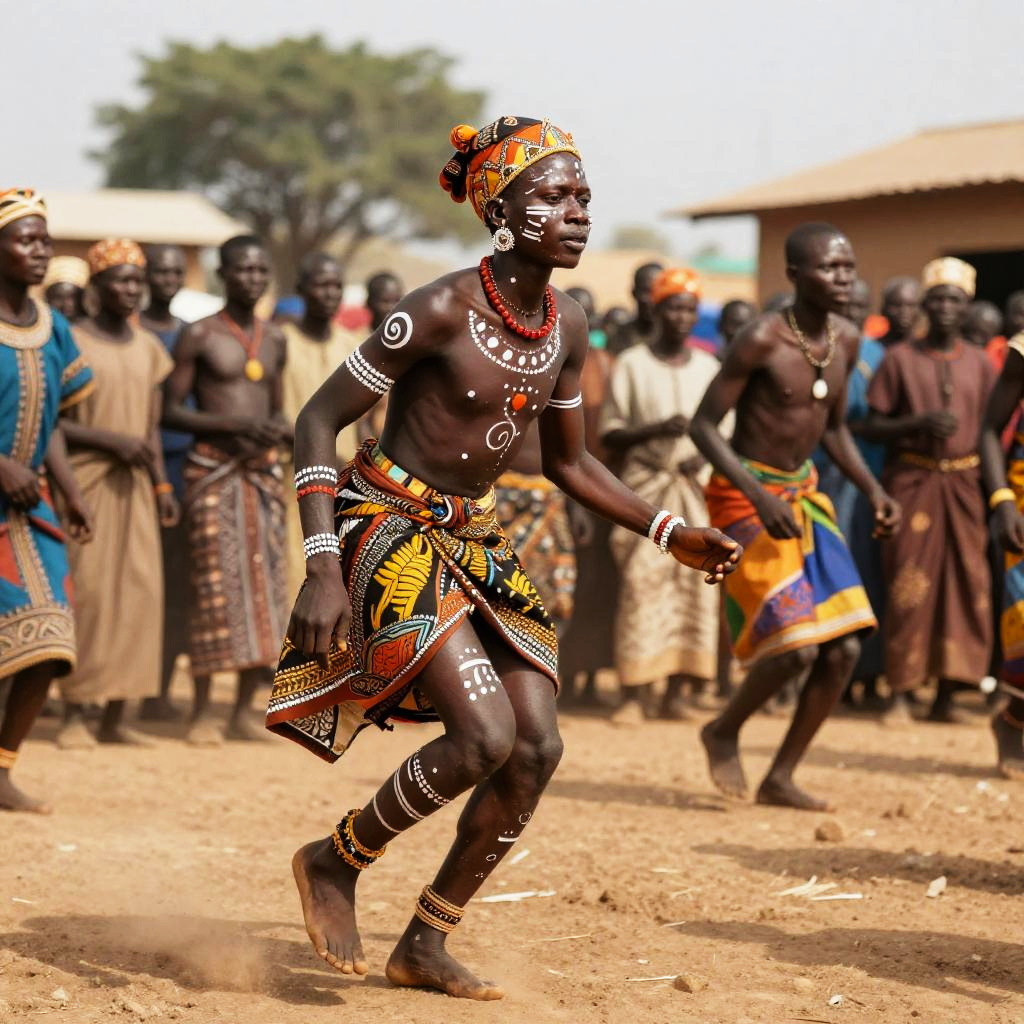 Dynamic depiction of African nude culture showcasing community life, ceremonial gatherings with traditional attire and body markings, vibrant colors and cultural symbolism, cinematic style.