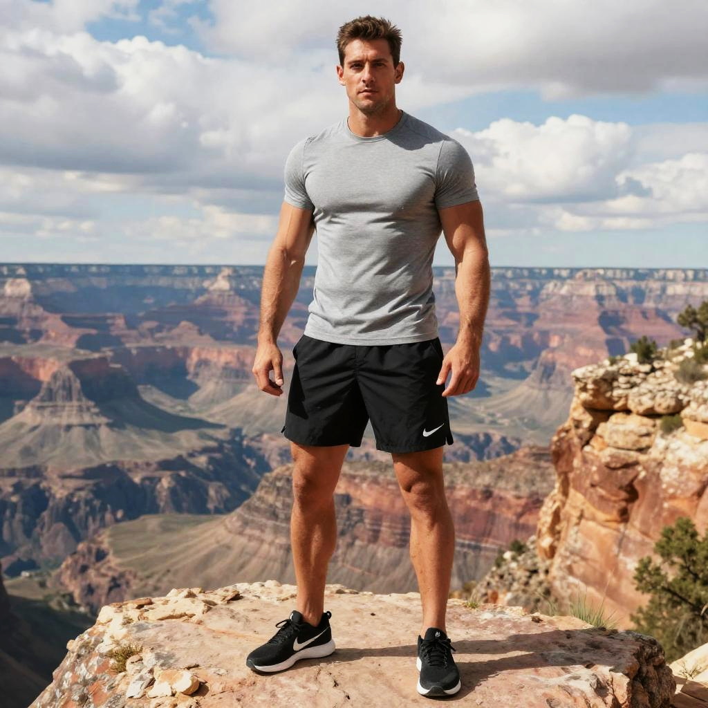 Photograph of a muscular, Caucasian man with short brown hair, wearing a gray t-shirt, black shorts, and black sneakers, standing on a rocky