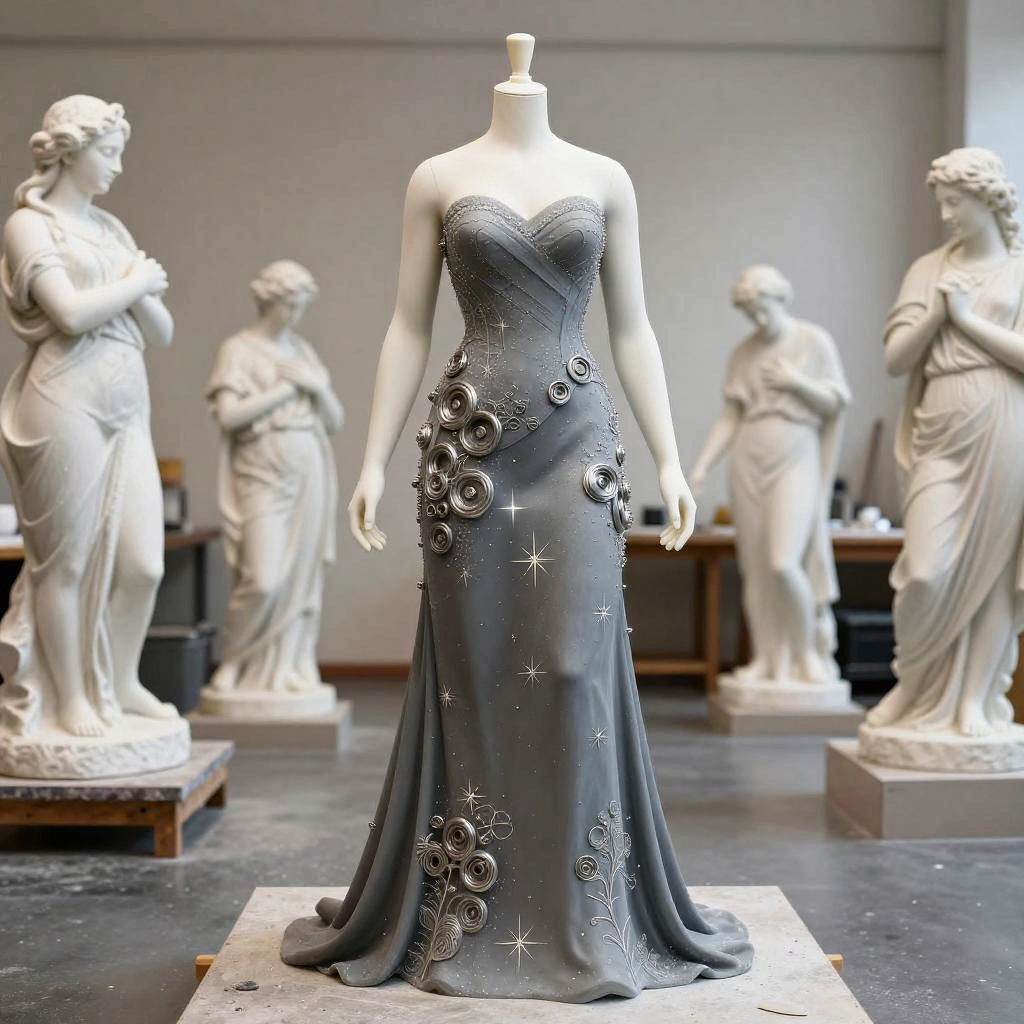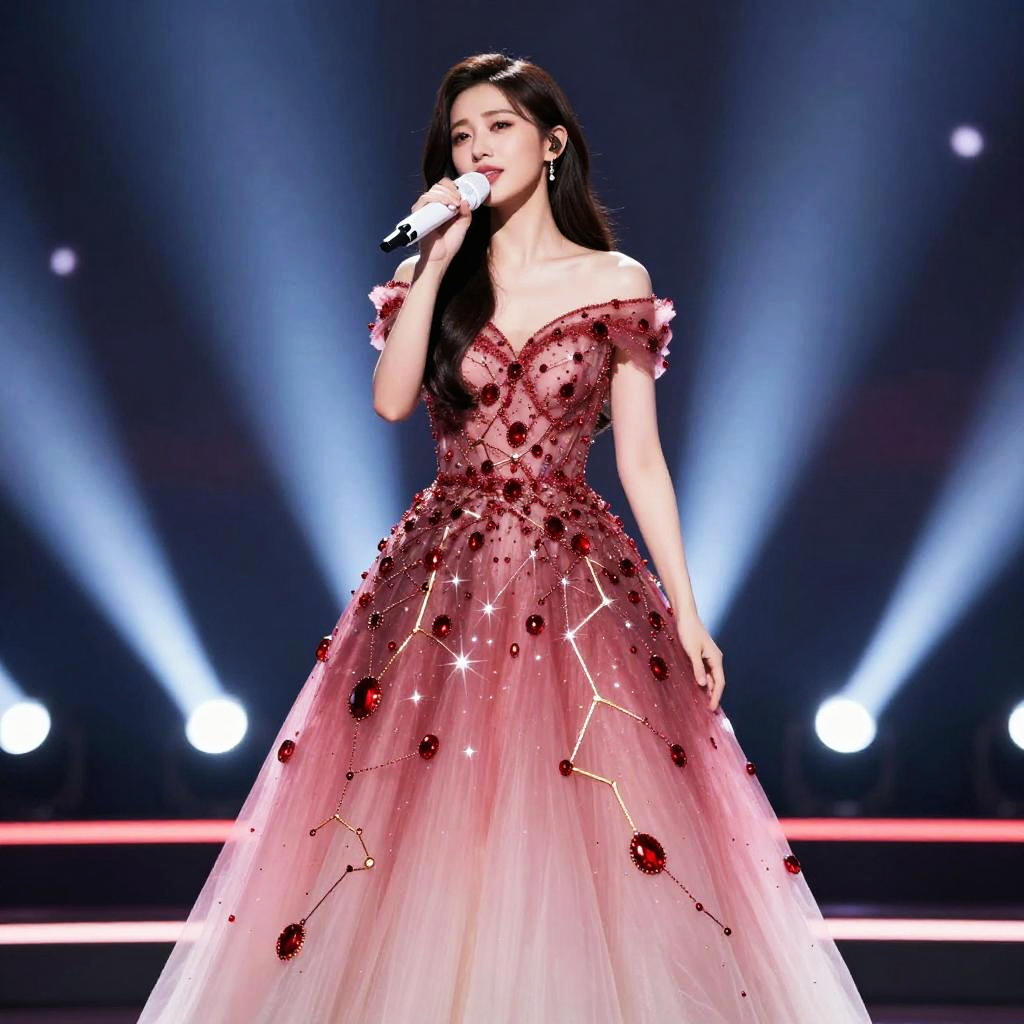 Detailed illustration of a singer wearing a stars‑embroidered evening gown in crimson pink, with ruby constellation patterns, set against a concert stage with spotlights