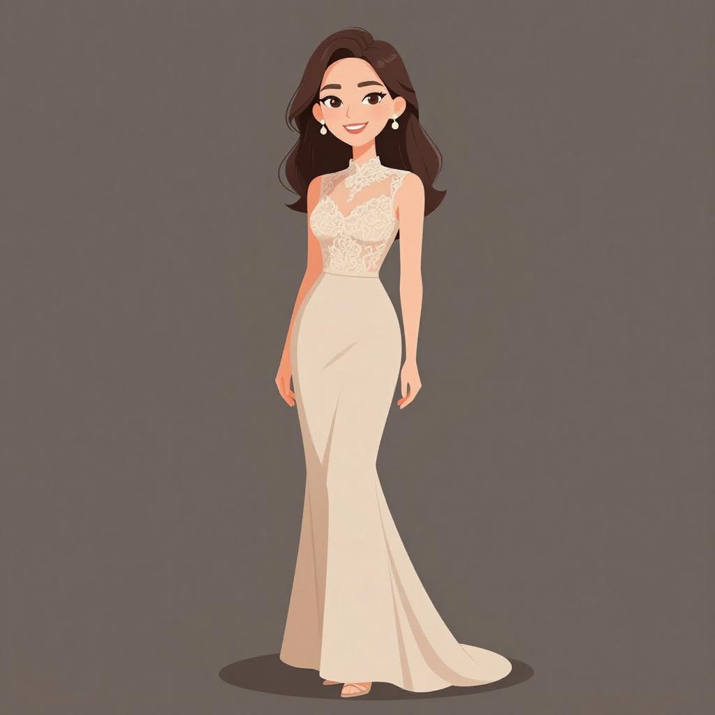 Stylized illustration of a confident young woman with long brown hair, wearing a floor-length, sleeveless beige gown featuring intricate lace detailing on the bodice and a high round neckline. The fitted gown flares gently towards the hem. She is accessorized with pearl drop earrings and minimal strappy heels, standing against a neutral studio background with a poised and smiling expression.