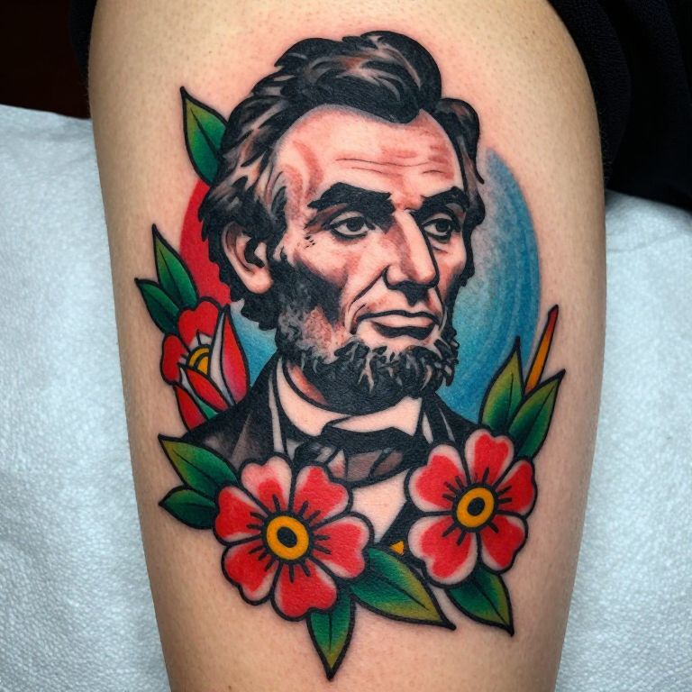 The image is a vibrant, neo-traditional style American tattoo design featuring Abraham Lincoln. The portrait is rendered with bold outlines and modern, stylized designs, characterized by flowing and organic lines that give it a dynamic and lively appearance. The colors are bright and varied, with a mix of reds, blues, and greens that create a striking contrast against the dark background. The design includes intricate details such as flowers and leaves, adding to the overall complexity and richness of the artwork. The composition is well-balanced, with the portrait centrally placed and surrounded by the floral elements, creating a harmonious and visually engaging piece. The use of 2D art techniques brings the design to life, making it appear as if it could be a tattoo on someone's skin. The overall effect is a powerful and artistic representation of the historical figure, captured in a contemporary and visually appealing manner.