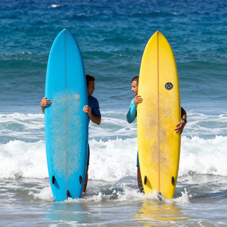 Two surfers stand side by side on their respective boards—a vibrant blue and a sunny yellow—engaging in conversation amidst gentle ocean waves at Oahu's North Shore.