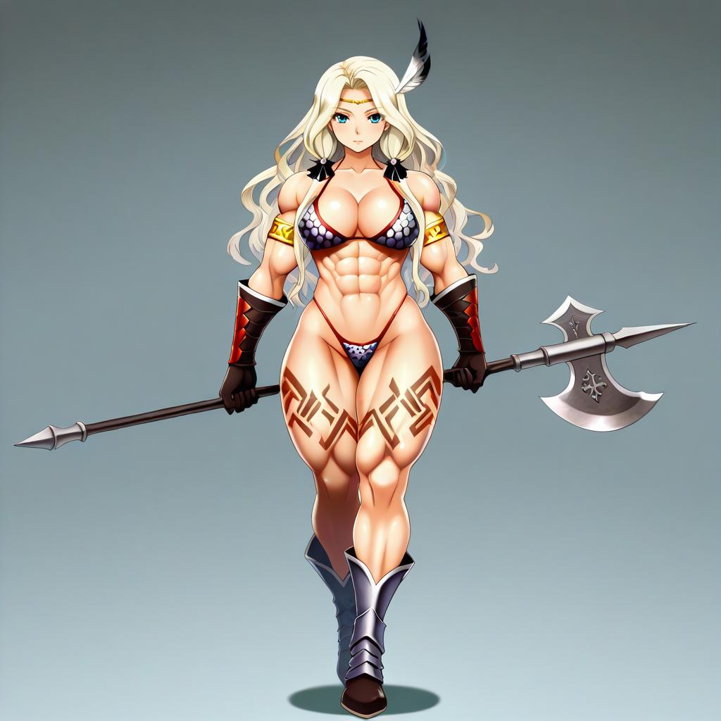 Digital artwork of a muscular female Amazon warrior inspired by Dragon's Crown. The character has long blonde hair adorned with feather accessories, vibrant blue eyes, and wears revealing blue scale-patterned bikini armor with red trim. She displays prominent abdominal muscles, thick thighs with geometric tattoos, fingerless gloves, boots with fur trim, a golden armlet, and a decorative circlet. She holds a large halberd weapon, embodying strength and fantasy battle readiness.