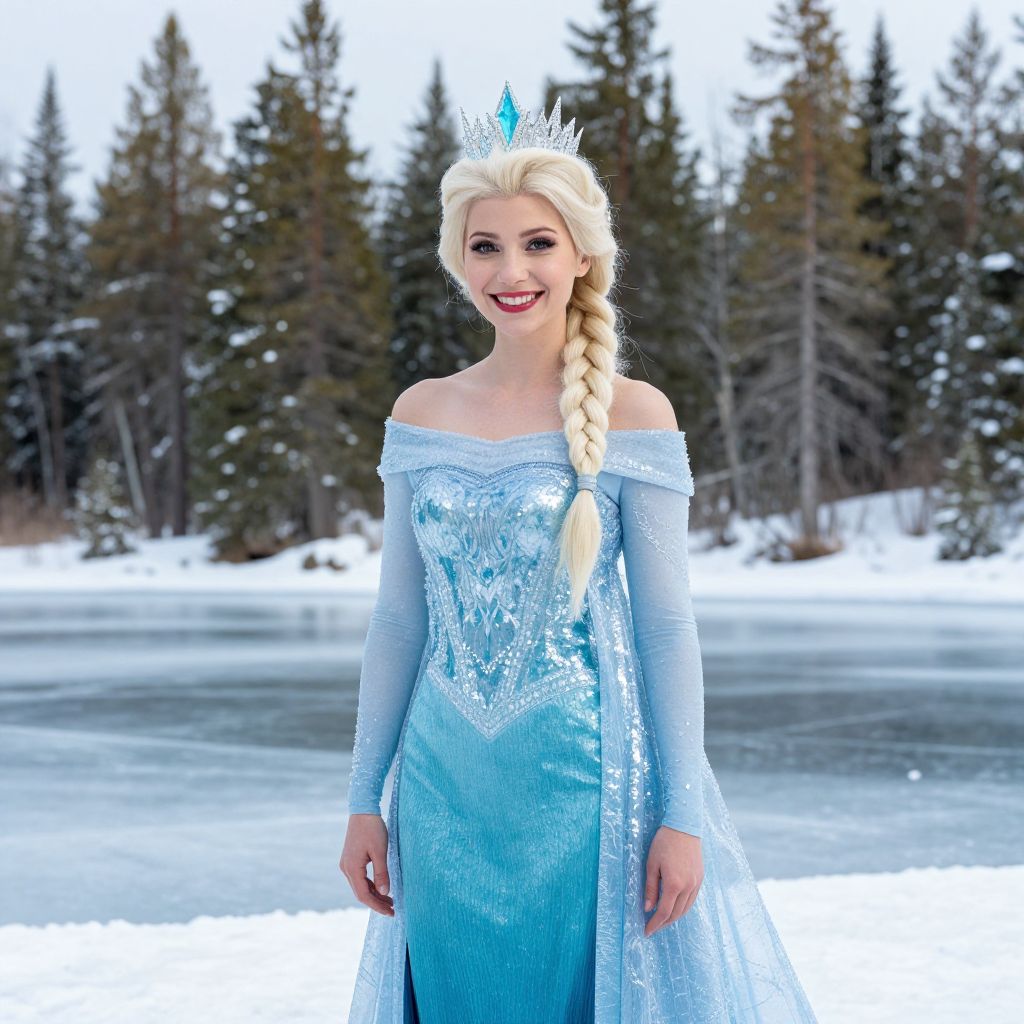 Photograph of a smiling blonde woman dressed as Elsa from Frozen, standing in a snowy forest by a frozen lake. She's wearing a sparkling, ice-blue Elsa gown with intricate patterns, an off-shoulder neckline, and a silver crown with a blue ice-like design. Her long braid drapes over her right shoulder. The background shows tall pine trees and a wintry landscape.