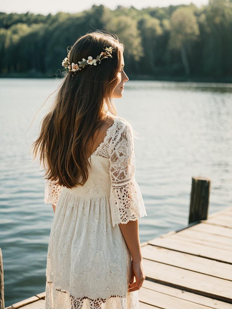 Young woman with long light brown hair wearing a white lace dress with intricate floral patterns, standing on a wooden dock by a calm lake. She has a delicate flower crown in her hair, with soft natural sunlight illuminating her profile and gentle breeze moving her hair. The background features out-of-focus trees and water, creating a peaceful and serene atmosphere.