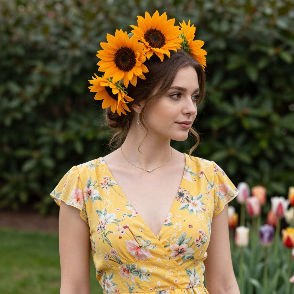 Photograph of a young woman with fair skin and brown hair, wearing a yellow floral dress and a sunflower headband, standing in front of green
