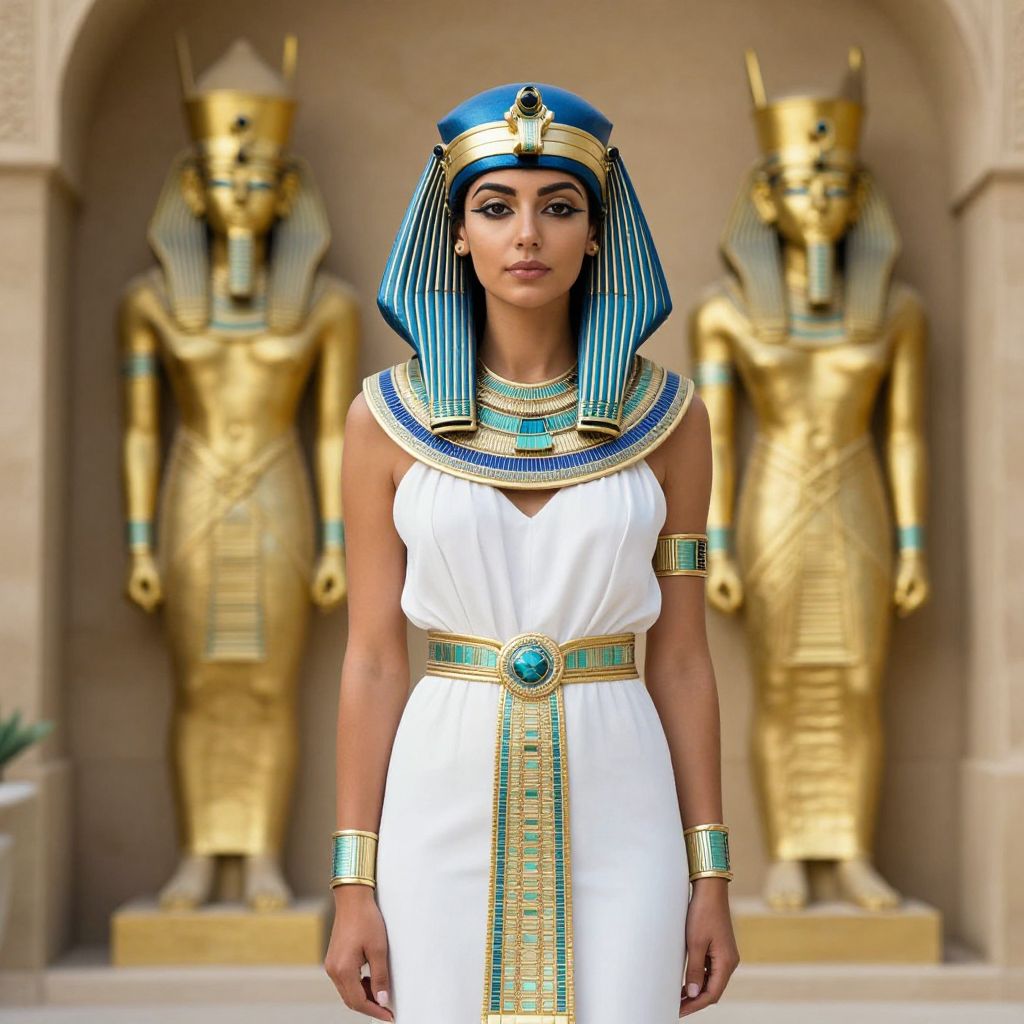 Digital artwork of a woman in ancient Egyptian attire with blue-striped headdress, white dress, gold jewelry, standing before golden statues.
