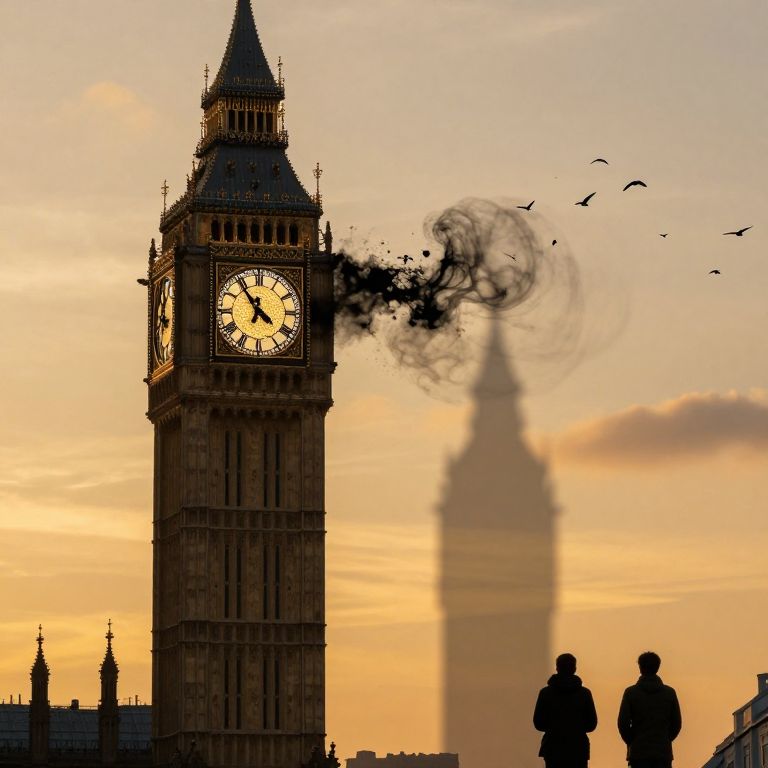 Photograph of Big Ben clock tower with black smoke emerging, shadowed silhouette of two people, birds flying, golden sunset sky.