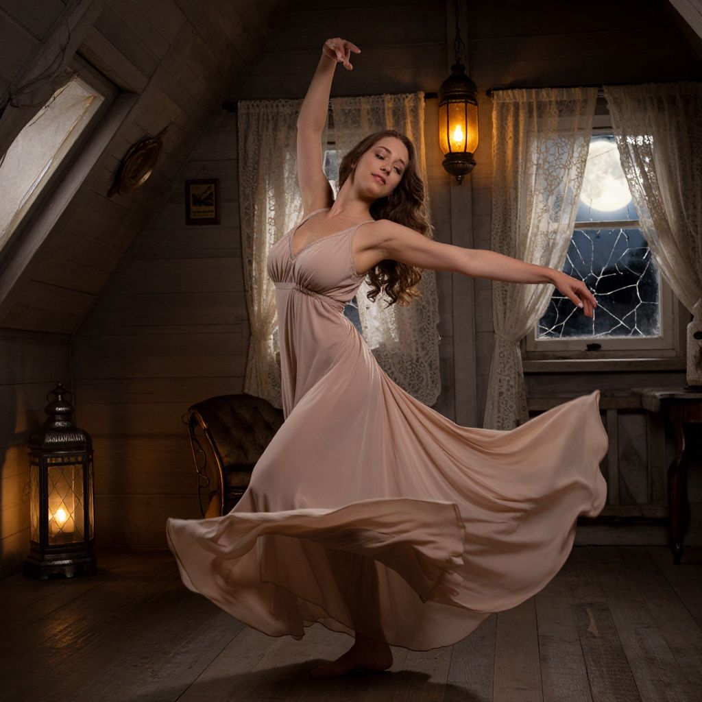 A woman with long brown hair and soft, warm hazel eyes dances in a flowing nightgown dance costume in a dimly lit vintage attic filled with old lanterns and lace curtains, moonlight streaming through cracked windows, the fabric of the nightgown swaying gently as she moves with a graceful, hypnotic rhythm.. The woman has big tits and cute face