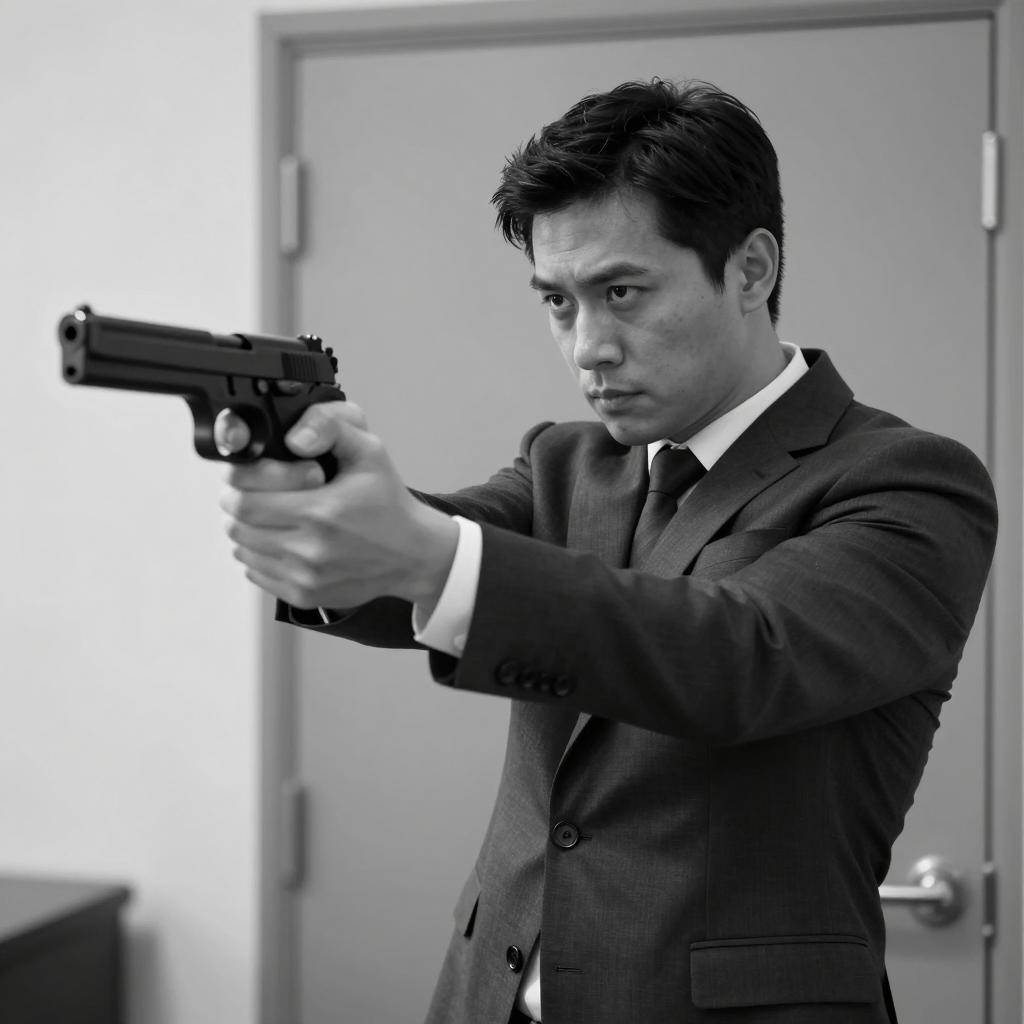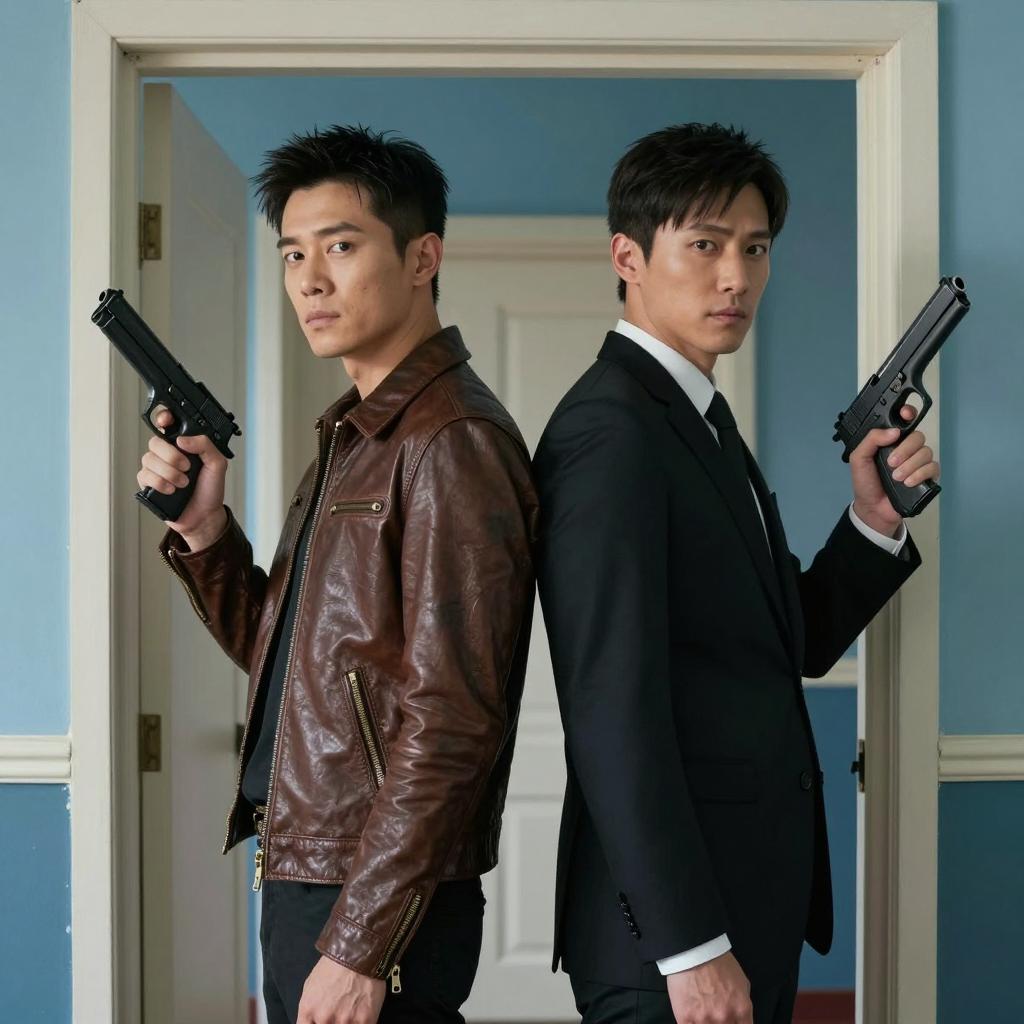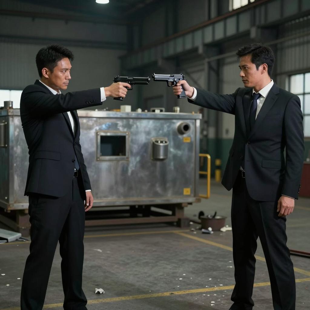 Two men in dark suits with guns pointing at each other in an industrial warehouse. Large metallic object in background, dim lighting, scattered debris on floor. Both men have intense expressions.
