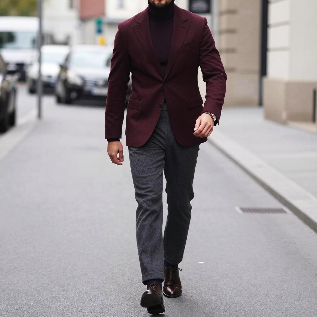 A stylish man dressed in a modern artistic fashion, with a fitted burgundy blazer, charcoal trousers, and brown leather shoes, walks confidently on a city street.