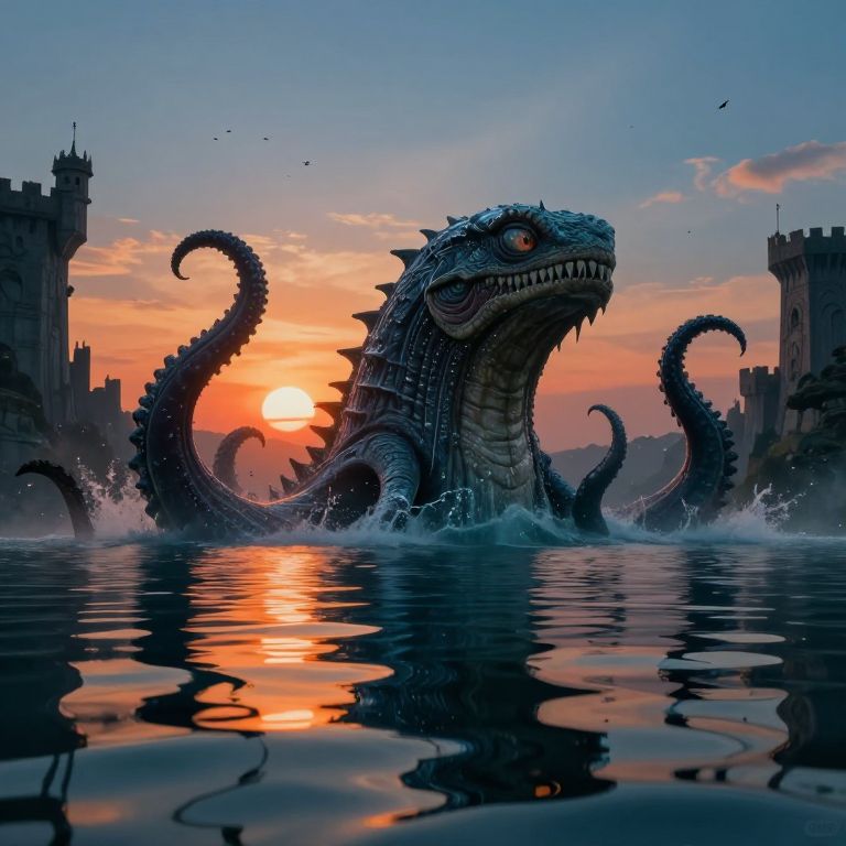 The image depicts a surreal, asymmetrical landscape where a massive, intricately detailed water monster emerges from the depths, its jagged, tentacle-like appendages reaching towards the surface. The creature's eye, a glowing orb, peers through the water, casting an eerie light that contrasts with the warm, broken sunset in the background. The sky is a tapestry of orange and blue hues, with birds scattered across the horizon, adding a sense of scale and movement. The water's surface is rippled, reflecting the monster's form and the sky's colors, creating a fractal iridescence that enhances the otherworldly atmosphere. The scene is framed by ancient, castle-like structures on either side, their architecture blending with the natural elements, suggesting a mystical, futuristic world where nature and civilization coexist. The overall composition is balanced yet dynamic, with the monster's presence dominating the center, while the sunset and the castle-like buildings provide a sense of depth and perspective.