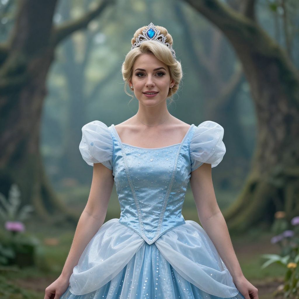 A woman dressed in a detailed blue Disney princess costume with puffed sleeves and a jeweled tiara stands in an ethereal forest setting, rendered in a cinematic realism style. The image captures an enchanting fantasy atmosphere with soft lighting and a dreamy, mystical background.