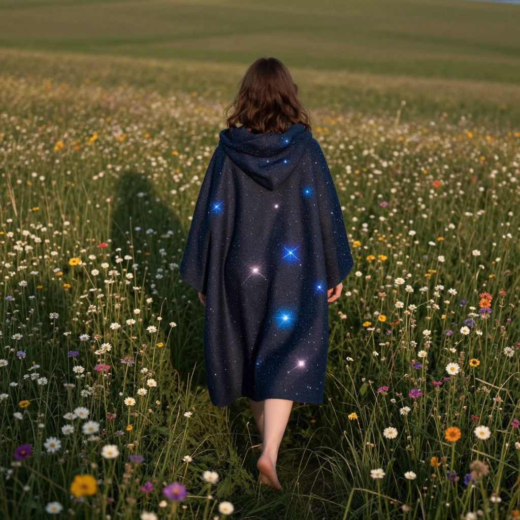 A photograph of a person with shoulder-length brown hair, viewed from behind, walking through a vibrant meadow filled with colorful wildflowers. They wear a dark blue, star-patterned cloak that contrasts with the bright flowers. The person is barefoot, and the meadow stretches into a green, slightly blurred horizon. The cloak features glowing blue star-like designs, adding a magical element to the natural setting. The sunlight casts soft shadows, enhancing the serene, ethereal atmosphere. The image combines elements of fantasy and nature, creating a peaceful, otherworldly scene.