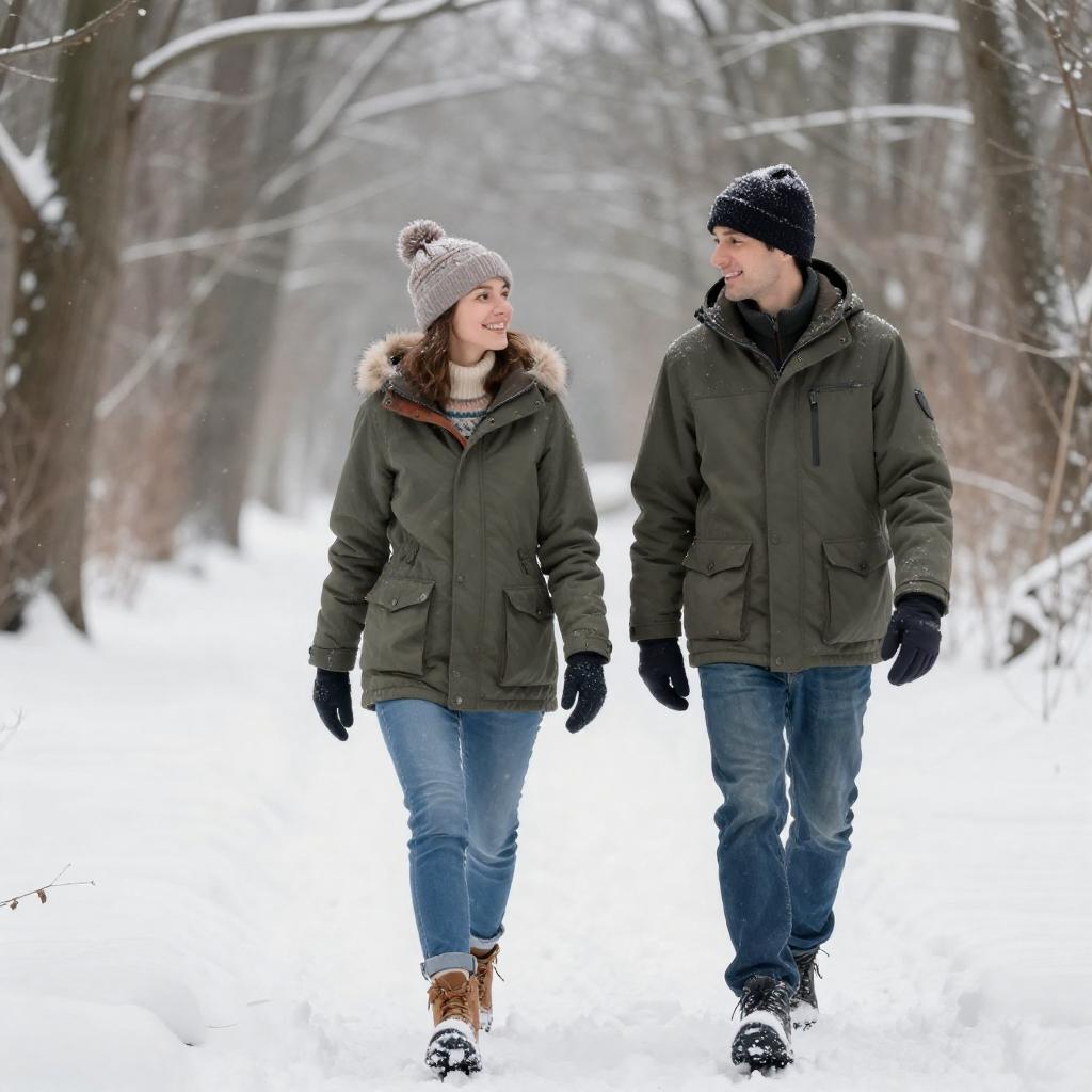 Photograph of two people walking in a snowy forest. Woman on left wears green jacket, patterned sweater, knit hat, gloves, blue jeans. Man on right wears green jacket, black beanie, dark gloves, blue jeans. Both smiling, snow falling, trees with snow-covered branches in background. Woman looks left, man looks forward. Snow on ground, path in foreground.