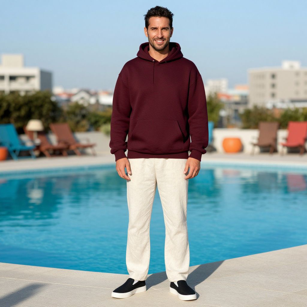 A man, designer burgundy hoodie, oversized fit, cream linen track pants, classic black slip-on sneakers, relaxed yet polished style, sun-drenched rooftop pool, city skyline backdrop, vibrant lounge chairs, Holga camera style, confident smile. Man has masculine face and piercing eyes