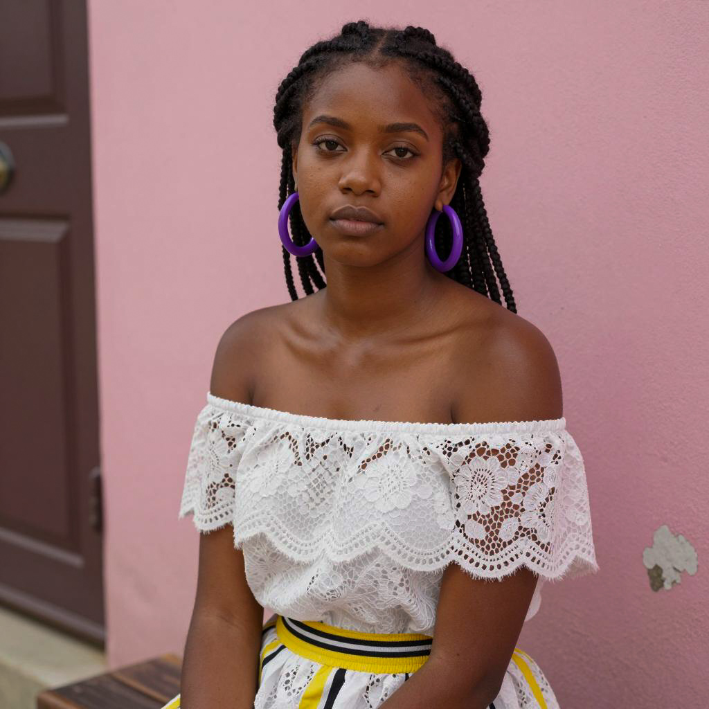 Red dress brown skin, photograph of beautiful black woman with dark skin, wearing a red spaghetti strap dress, standing in a lush garden, surrounded by colorful roses, sunny day, green foliage in background, gentle smile, subtle makeup, small hoop earrings, natural light, medium shot, vibrant colors, realistic style, summer vibe, peaceful and serene atmosphere