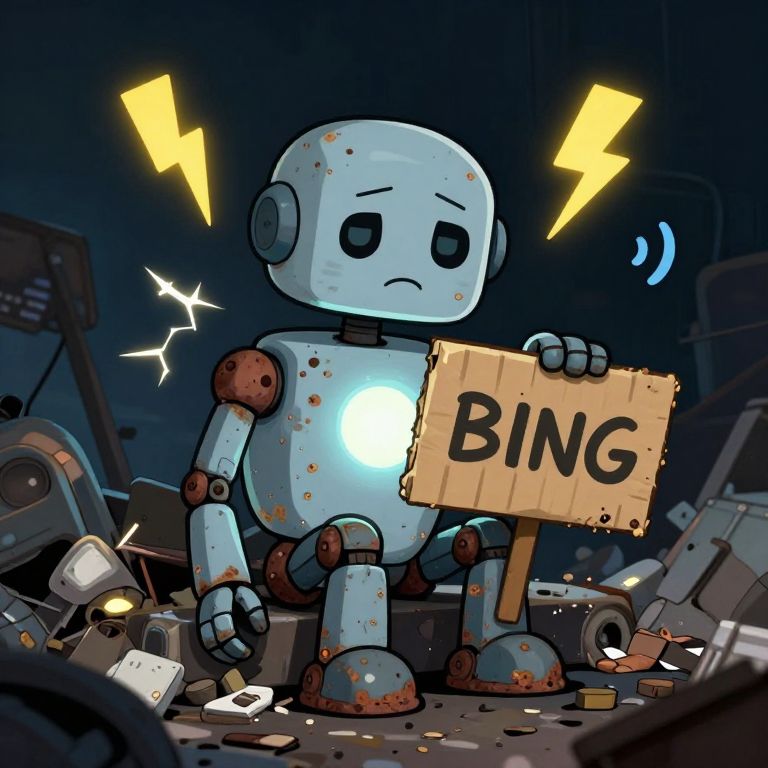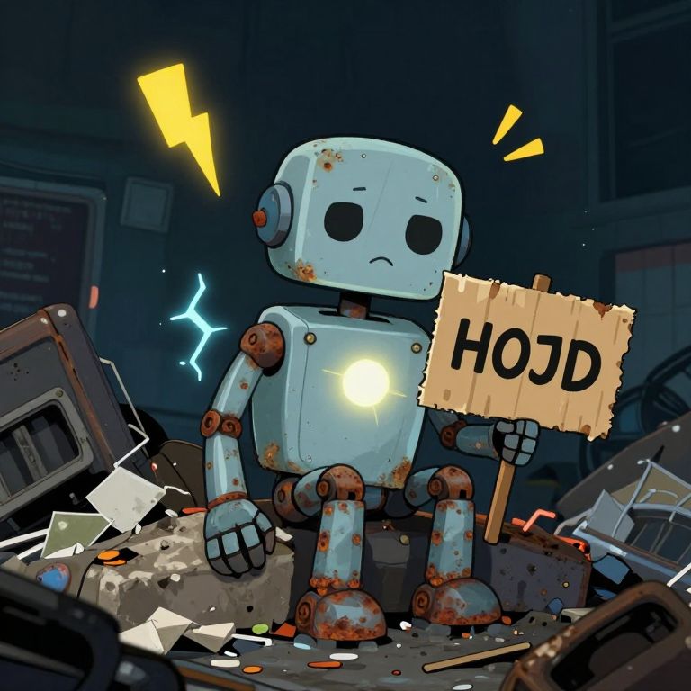 A cartoon styled drawing of a very sad, lonely robot, The robot sits alone on a scrap heap in a junk pile, The robots limbs are rusted and worn, Electricity crackles, A lighting bolt symbol, the buzz symbol is a dim light on the robots chest, The robot holds a cardboard sign, text
