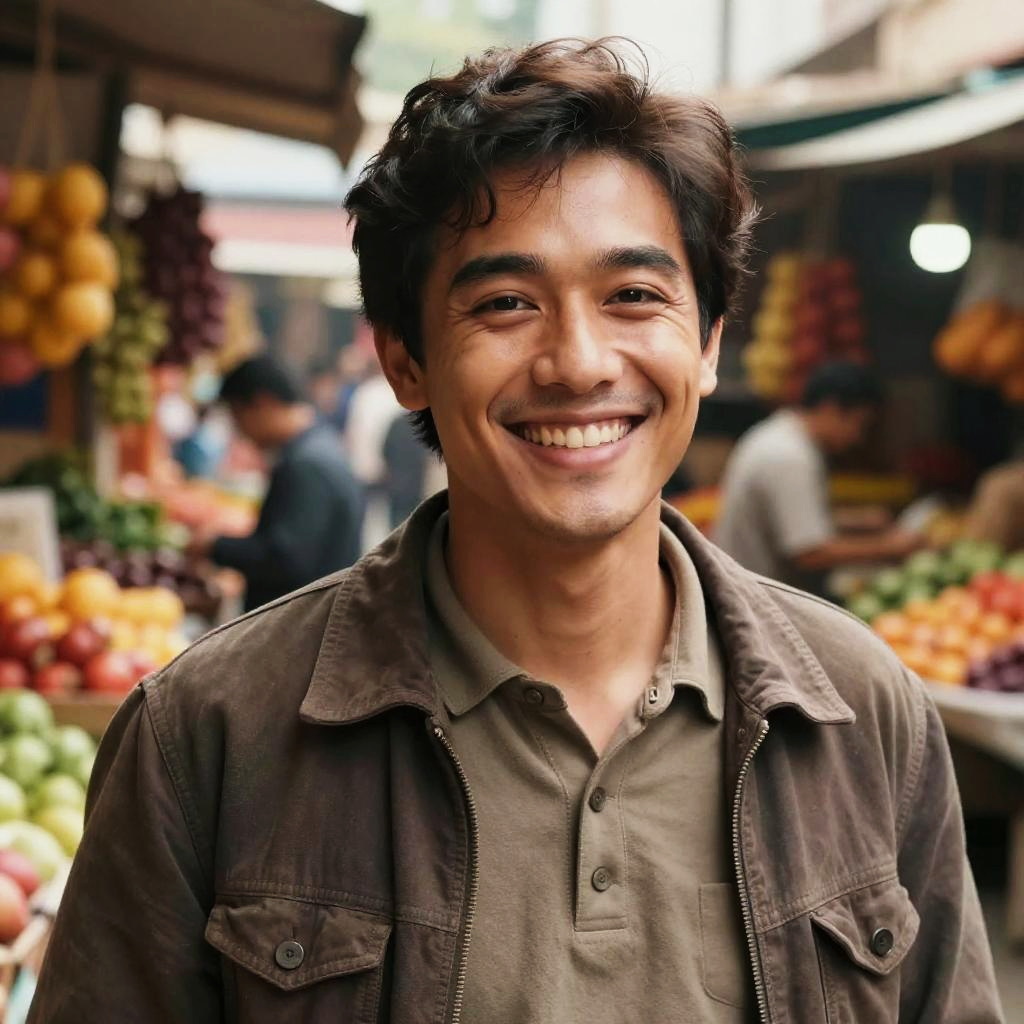 The happy merchant, joyful businessman smiling broadly in a bustling marketplace, vibrant colors, detailed facial features, intricate background, cinematic lighting, hyper-realistic style