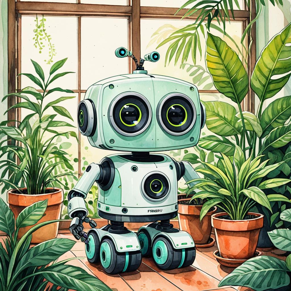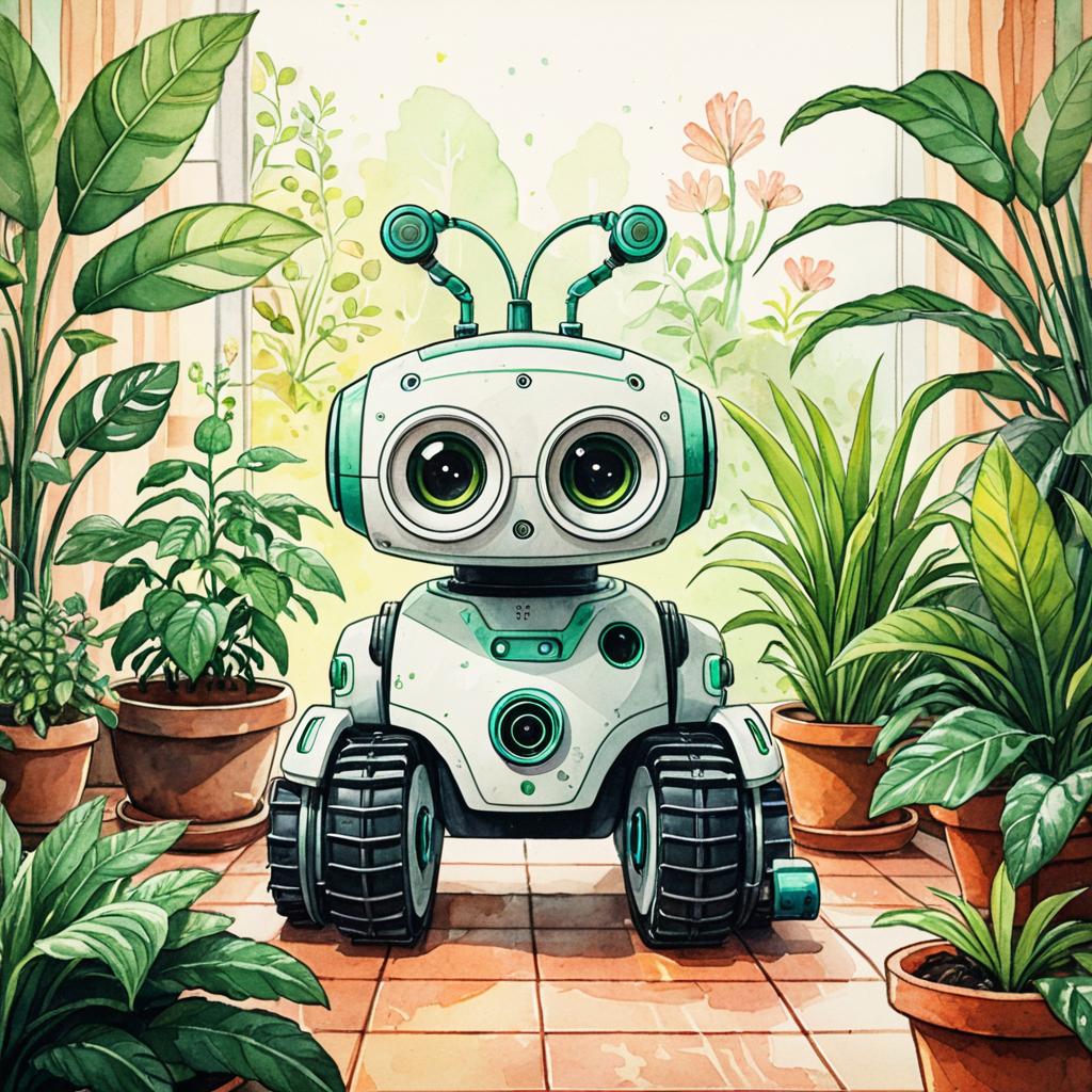 Illustration of a friendly robot designed for watering plants, standing in a lush indoor garden surrounded by various potted plants. The robot features large expressive eyes, a smooth pastel green body with mechanical hands, and an antenna on its head. The setting includes vibrant green foliage and terracotta pots, rendered in warm pastel watercolor style.